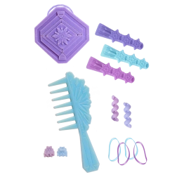 - Šukavimo galva, šepetys, 5 segtukai (3 su snaige), 4 gumytės (violetinės ir mėlynos), didelė snaigės formos puošmena, 2 rietimo voleliai