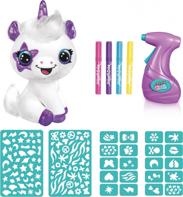 Paversk baltą pliušinį vienaragį originaliu kūriniu. Naudodamasis paprastu airbrush įrankiu ir lipniais šablonais sukursi žvaigždes, širdeles ir spalvinius perėjimus. Kai panorėsi pokyčių, pakanka nuplauti ar išskalbti šaltame vandenyje ir gali kurti vėl.