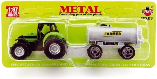 Traktoriaus modelis su dideliais juodais ratais ir pilku tanklaiviu, pažymėtu „FARMER“.