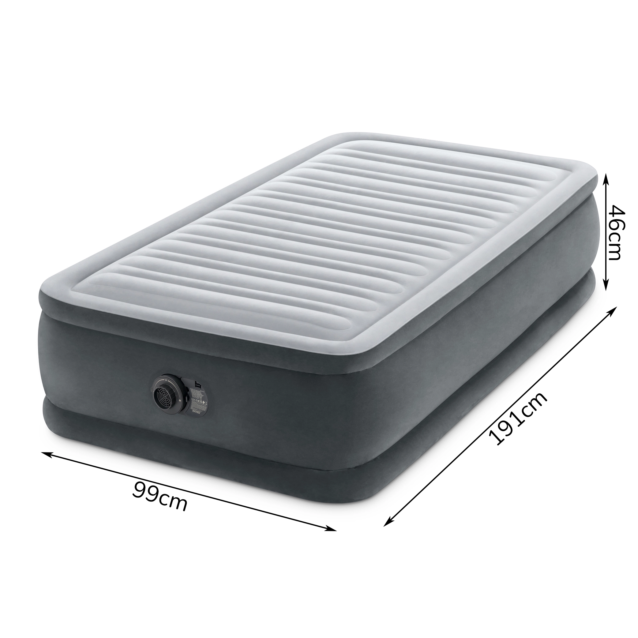 Integruotas elektrinis siurblys pripučia ir išleidžia čiužinį per kelias minutes – be pastangų, švariai ir greitai. Patvarus PVC su vandeniui atspariu, veliūriniu paviršiumi tinka kasdieniam naudojimui, maksimali apkrova – 136 kg. Pridedamas transportavimo krepšys patogiam laikymui ir pernešimui.
