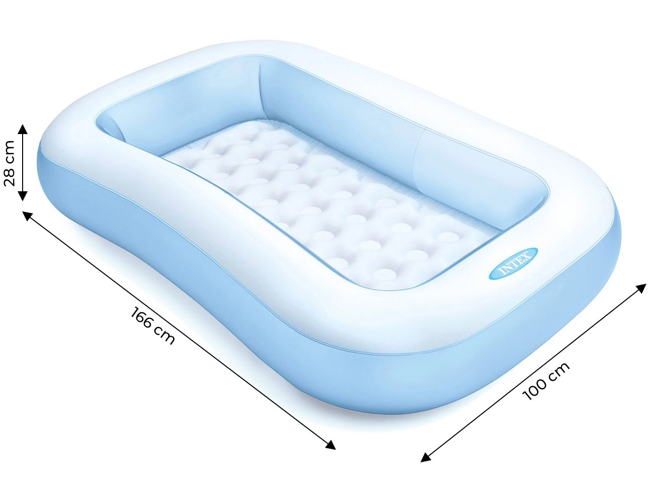 Matmenys 166 × 100 × 28 cm ir 18 cm vandens lygis idealiai tinka mažesniems vaikams. 0,30 mm PVC medžiaga atlaiko ne vieną sezoną įprasto naudojimo.