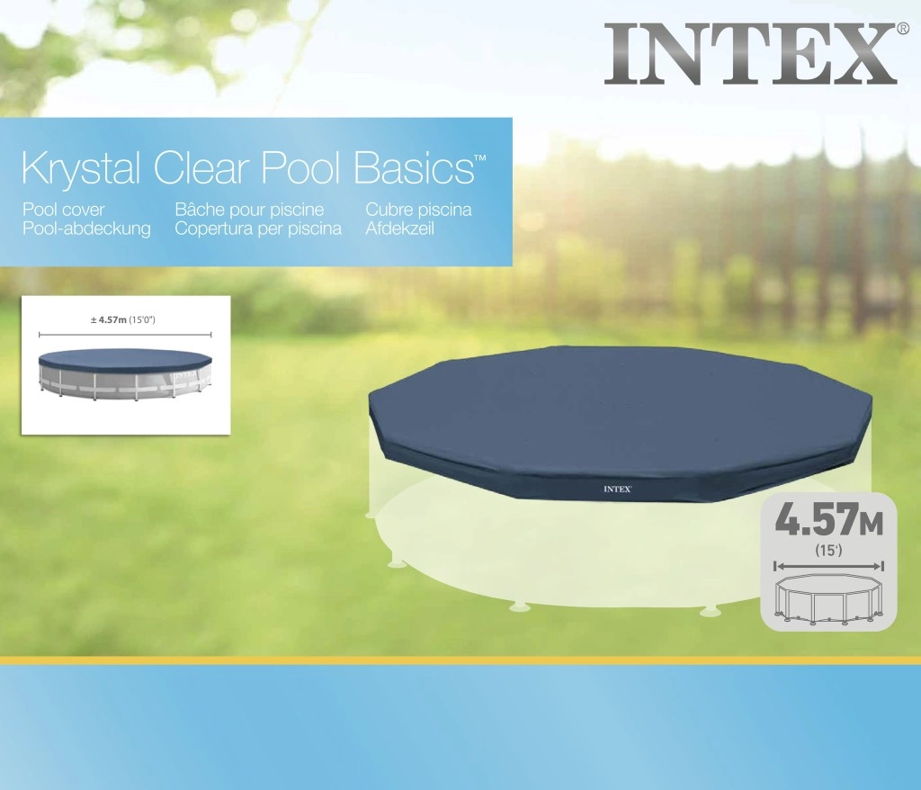 Kokybiškas rėminių baseinų uždangalas INTEX skirtas 457 cm skersmeniui. Patvari storo vinilo medžiaga neleidžia nešvarumams patekti į vandenį ir palengvina kasdienę priežiūrą. Dėl nutekėjimo angų ant paviršiaus nesikaupia lietaus vanduo.