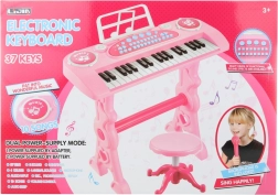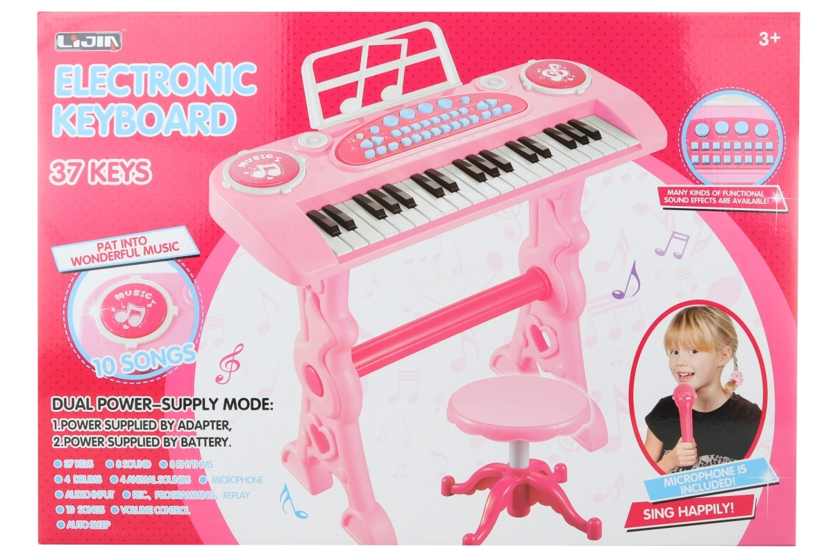 Rožinis pianinas vaikams su adapteriu siūlo platų muzikinių galimybių spektrą. Leidžia groti klasikinius garsus, įvairius melodinius fonus, rinktis skirtingus muzikos instrumentus ir net gyvūnų garsus. Puikiai tinka vaikų muzikiniams gebėjimams lavinti.