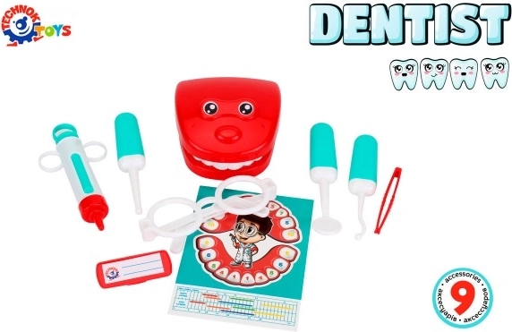 Šis spalvingas odontologo rinkinys idealiai tinka smalsiems mažiesiems gydytojams. Jame rasite viską, ko reikia linksmam žaislų „patikrinimui“: žandikaulio modelį, veidrodėlį, zondą, grąžtą, švirkštą, pincetą, akinius ir ženklelį. Taip pat pridedama aiški dantų numeracijos schema, padedanti vaikams lengvai perprasti dantų priežiūros pagrindus.
