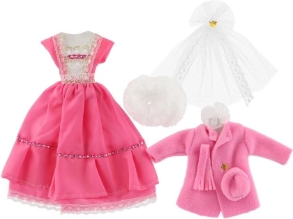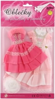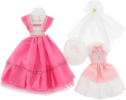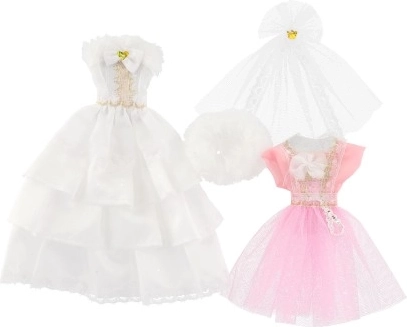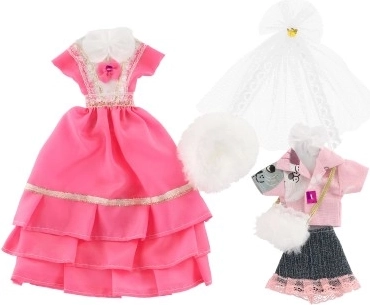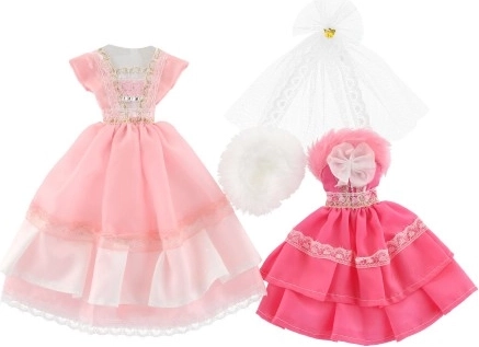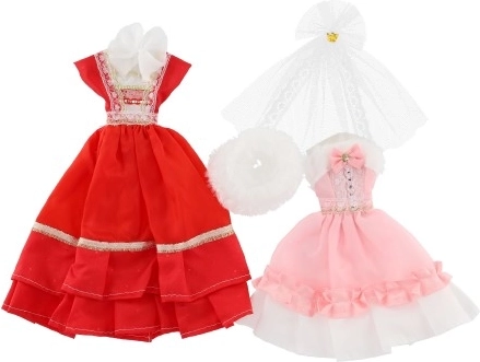 Dvi skirtingos suknelių komplektacijos, kiekviena su savitais akcentais, suteikiančiais kiekvienai lėlei išskirtinę išvaizdą.