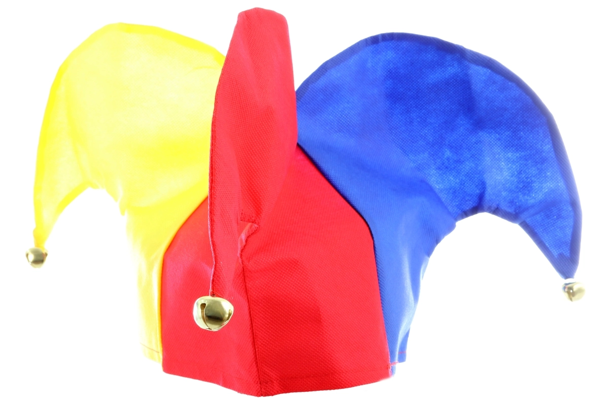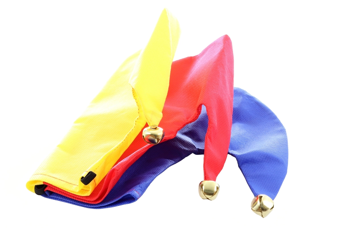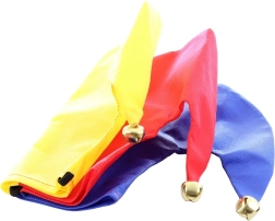 Spalvinga klauno kepurė geltonos, raudonos ir mėlynos spalvų su metaliniais varpeliais – žaismingam efektui kiekvieno judesio metu.