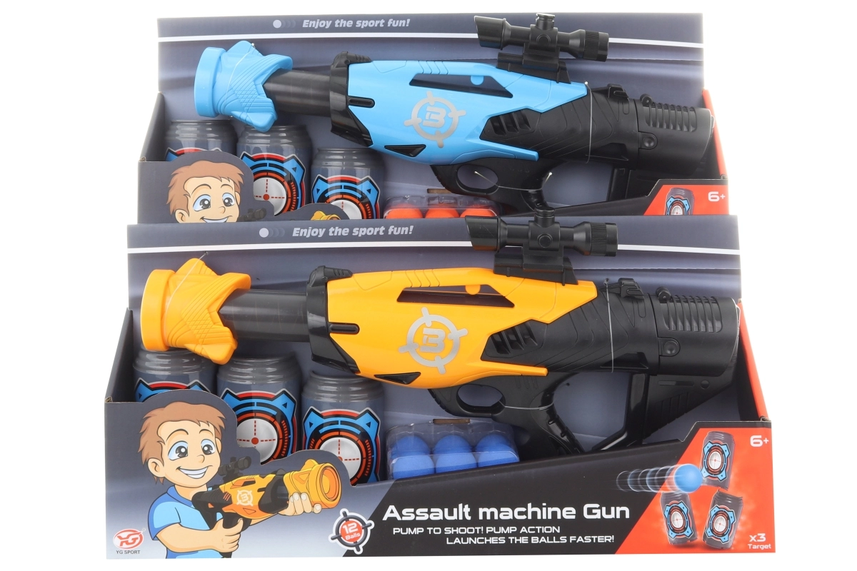 Šis plastikinis pistoletas putos kamuoliukams yra idealus vaikams, mėgstantiems veiksmo žaidimus. Į komplektą įeina trys plastikinės skardinės su taikiniu ir dvylika kamuoliukų, leidžiančių kurti ir sudėlioti įvairius iššūkius. Pistoletas sukurtas taip, kad būtų lengvas ir paprastai valdomas.