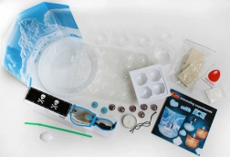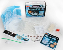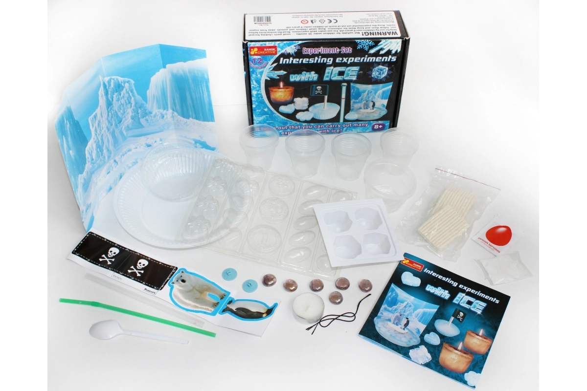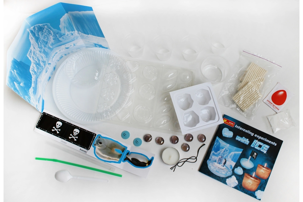 Pakuotėje yra įvairių įrankių ir medžiagų: ledo formelės, plastilinas, žvakė, akmenukai, puodeliai, šiaudeliai, maistiniai dažai, šablonai, siūlas ir kitos reikmenys. Taip pat pridedamos aiškios nuoseklios instrukcijos lietuvių kalba, todėl vaikai gali beveik iš karto pradėti eksperimentuoti.