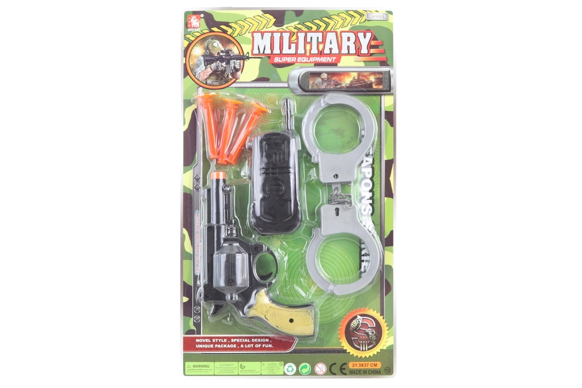 Linksmas karinis rinkinys mažiesiems nuotykių ieškotojams su realistiškais priedais aktyviam žaidimui. Įeina revolveris, trys kulkos su siurbtukais, racija ir antrankiai. Tinka vaikams nuo 3 metų.