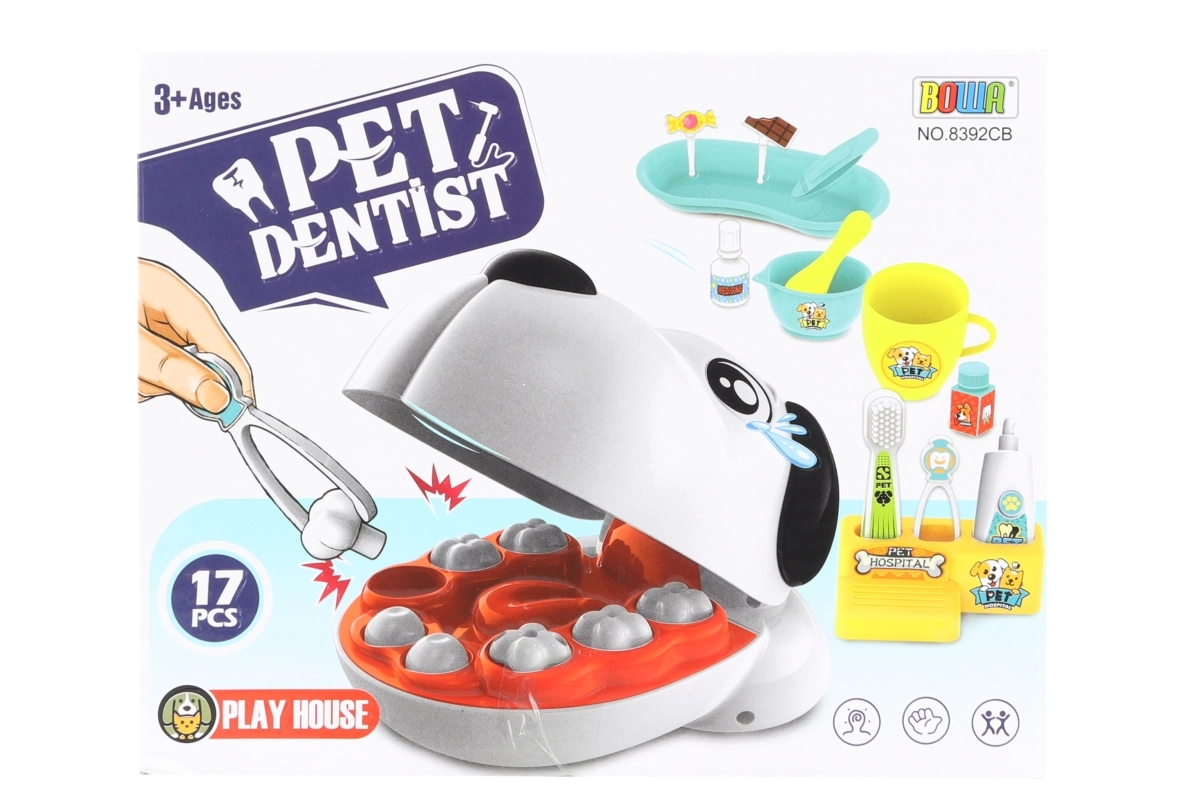 Miela šuns galva su atvira burna leidžia saugiai ir aiškiai „gydyti“ – apžiūrėti, gręžti ir „plombuoti“. Apšviestas veidrodėlis (su baterijomis) pagerina žaidimo patirtį ir padidina realistiškumą. Plastikinė „šokolado“ plytelė ir „saldainiai“ puikiai padeda paaiškinti, kodėl svarbu valyti dantis ir lankytis profilaktinėse apžiūrose.