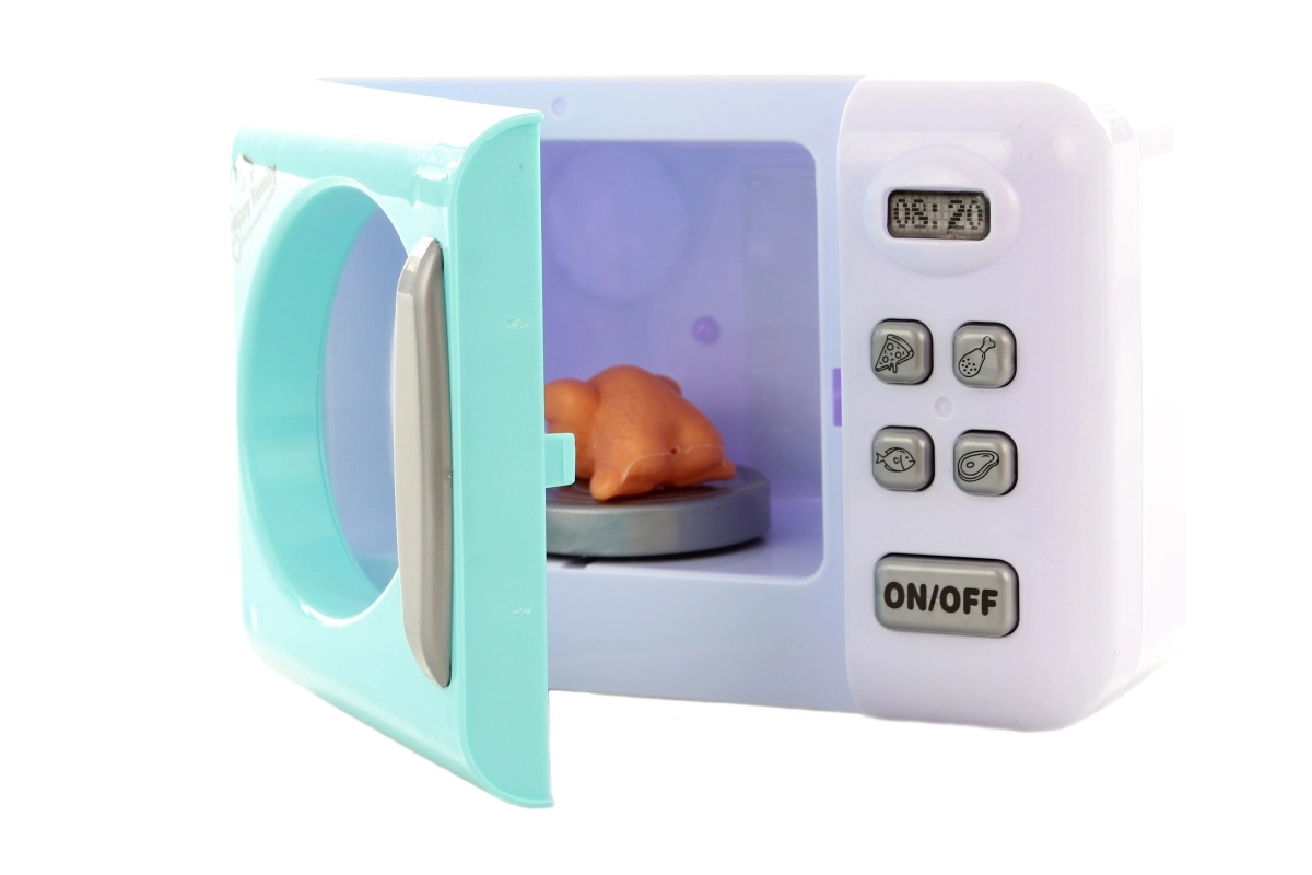 Linksma vaikiška baterijomis veikianti mikrobangų krosnelė mažiesiems virėjams nuo 3 metų. Įjungus, maistas ant lėkštės sukasi, o krosnelė šviečia, todėl gaminimo žaidimas tampa dar realesnis. Į komplektą įeina plastikinė višta, kad būtų galima žaisti iš karto ir lavinti fantaziją.