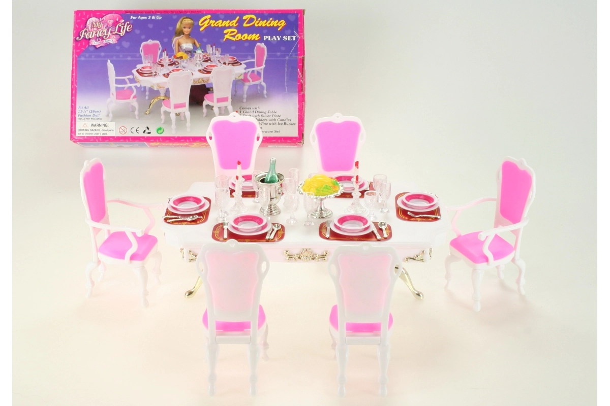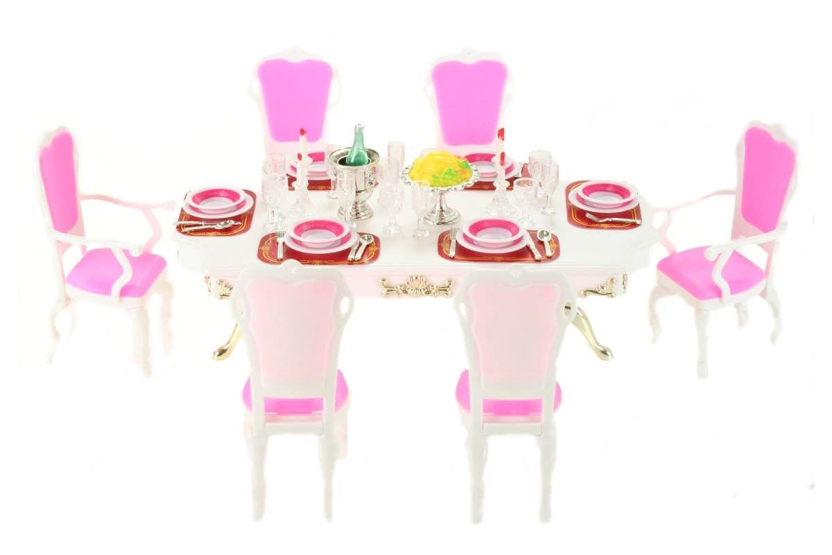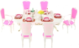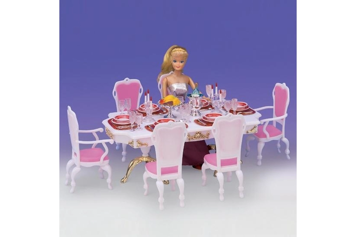 Stilingas Glorie rinkinys lėlių stalui pavers bet kurį kambarį elegantiška valgomąja. Rinkinyje yra didelis plastikinis stalas, 6 kėdės (2 su porankiais) ir gausi stalo serviruotė, įskaitant taures, lėkštes ir stalo įrankius. Tinka kūrybiniam žaidimui vaikams nuo 3 metų.