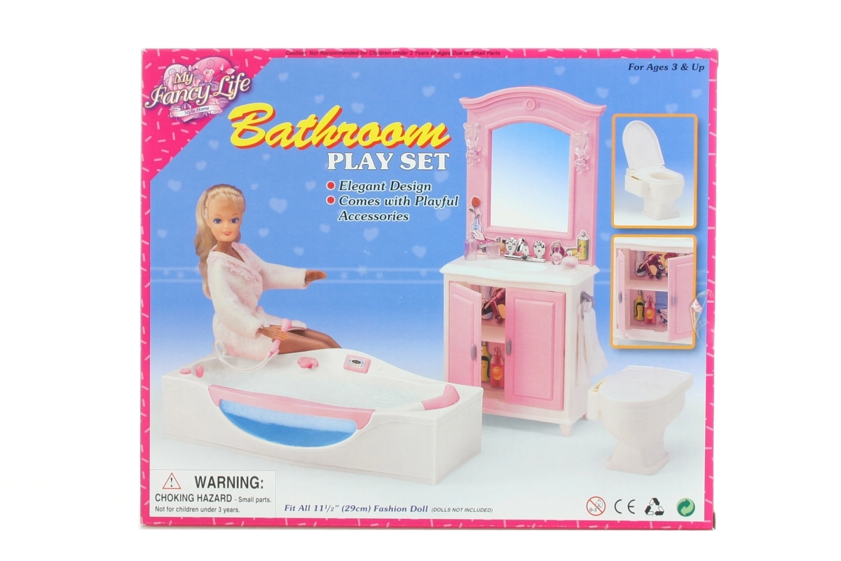 Rinkinyje yra tualetinis staliukas su praustuvu, vonia ir tualetas, taip pat maži priedai, kurie sukuria tikros vonios kambario atmosferą. Plastikinė konstrukcija užtikrina lengvą priežiūrą ir ilgą tarnavimo laiką kasdien žaidžiant.