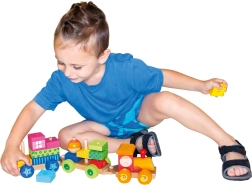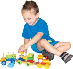 Daugiafunkcis medinis traukinukas yra ne tik tempiamas žaislas, bet ir konstruktorius, leidžiantis vaikams lavinti kūrybiškumą. Į traukinuką įeina trys važiuoklės ir 18 skirtingų kaladėlių, kurias galima dėlioti pagal fantaziją.