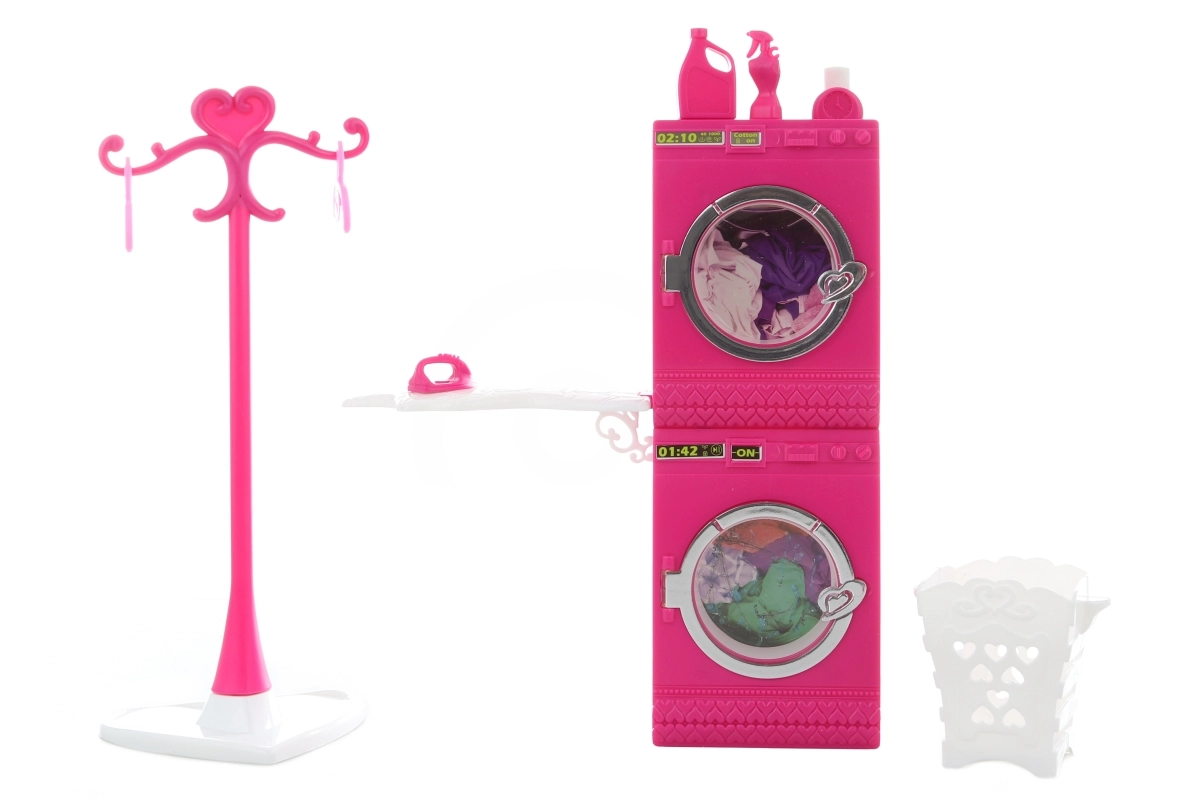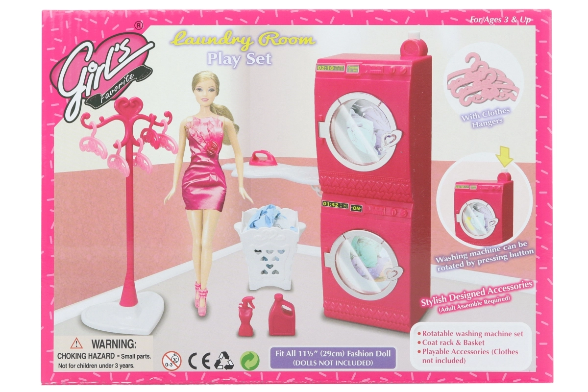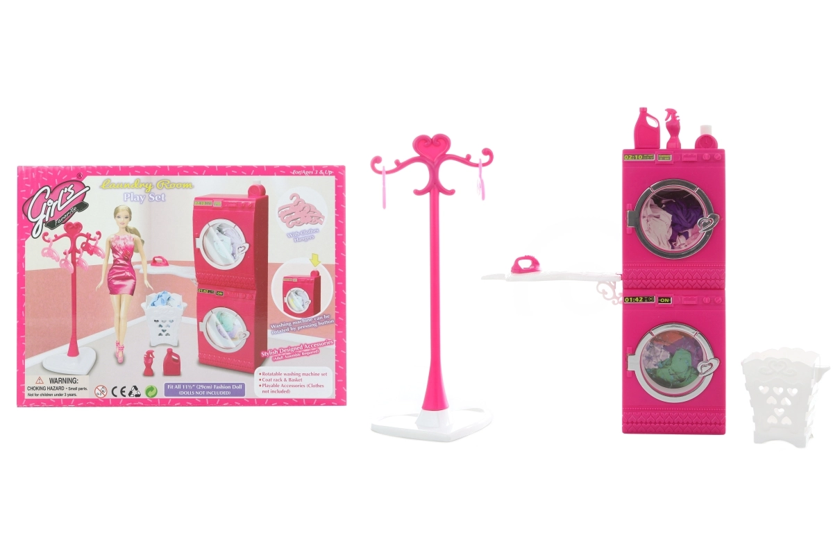 Suteikite vaikams realistišką žaidimą su pilnu Glorie skalbyklos rinkiniu. Rinkinyje yra skalbimo mašina, kuri sukasi paspaudus mygtuką, džiovyklė, lygintuvo lenta, kabyklą, skalbyklės krepšys ir pakabos. Puikus priedas lėlių namams nuo 3 metų.