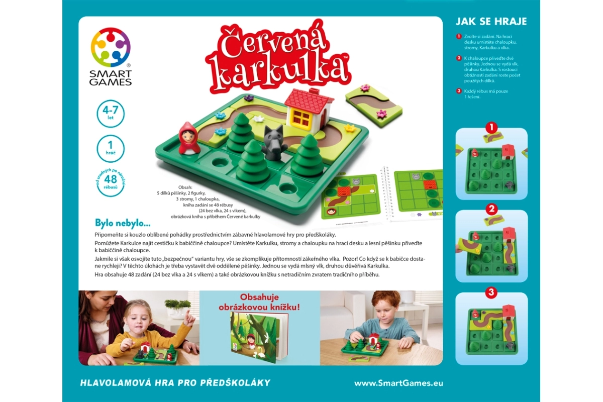 Galvosūkių žaidimas Raudonkepuraitė suteikia mažiausiesiems ir pramogą, ir mokymąsi. Išdėliokite figūrėles ir miško elementus ant lentos ir sukurkite kelią pas močiutę. Puikiai tinka vaikų strategijos ir loginio mąstymo lavinimui: