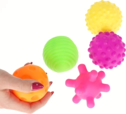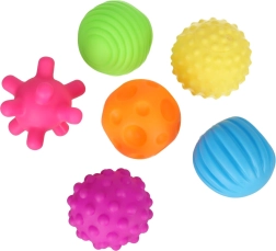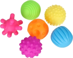 Spalvingas šešių sensorinių kamuoliukų rinkinys su skirtingomis tekstūromis pojūčių ir smulkiosios motorikos lavinimui. Idealu patiems mažiausiems: lytėjimo receptorių stimuliacija, spalvų ir formų mokymasis, akių–rankų koordinacija ir atpalaiduojantis masažas. Puikus pasirinkimas namuose, maudynių metu ir reabilitacijoje.