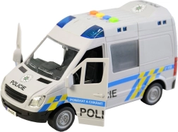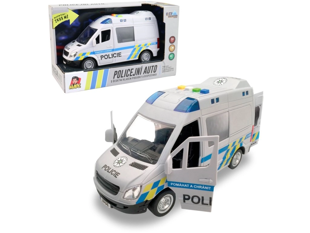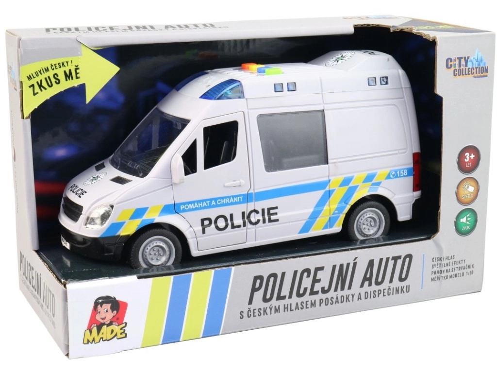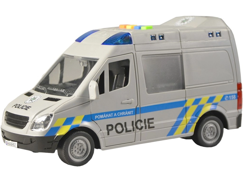 Realistiškas policijos mikroautobusas mažiesiems gelbėtojams siūlo čekiškus įgulos ir dispečerio balso pranešimus, veikiantį mėlyną švyturėlį ir inercinį pavarą. Atidaromos durys ir detalus 1:16 mastelio modelis užtikrina daug pramogų. Transporto priemonės ilgis 21 cm, maitinimas 3× 1,5 V AG13. Tinka vaikams nuo 3 metų.