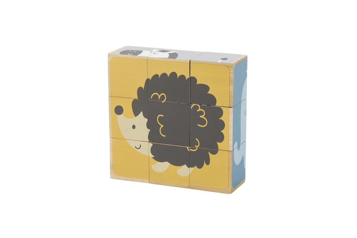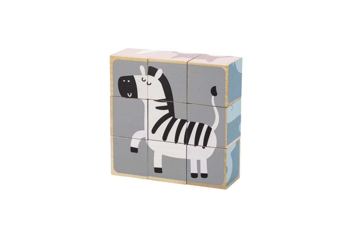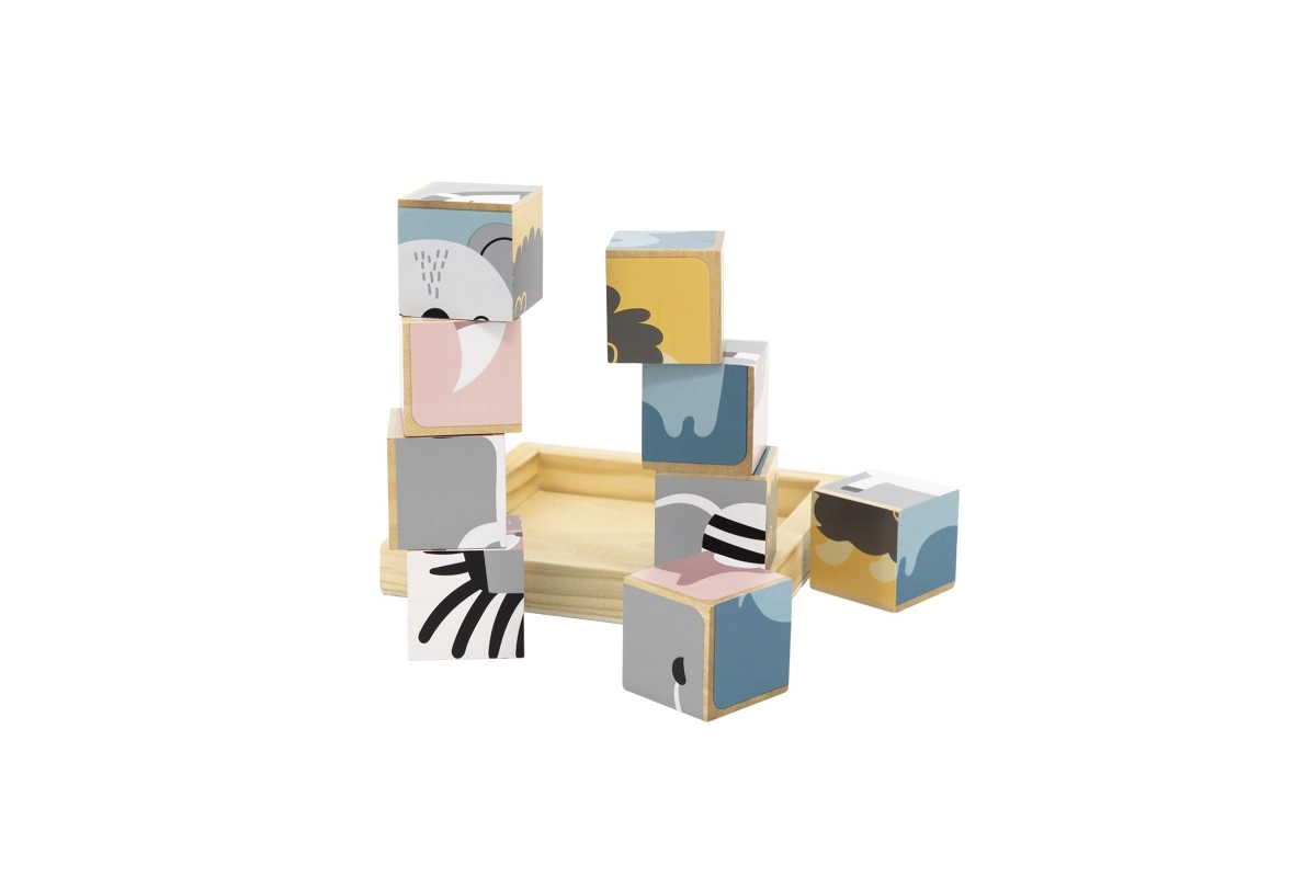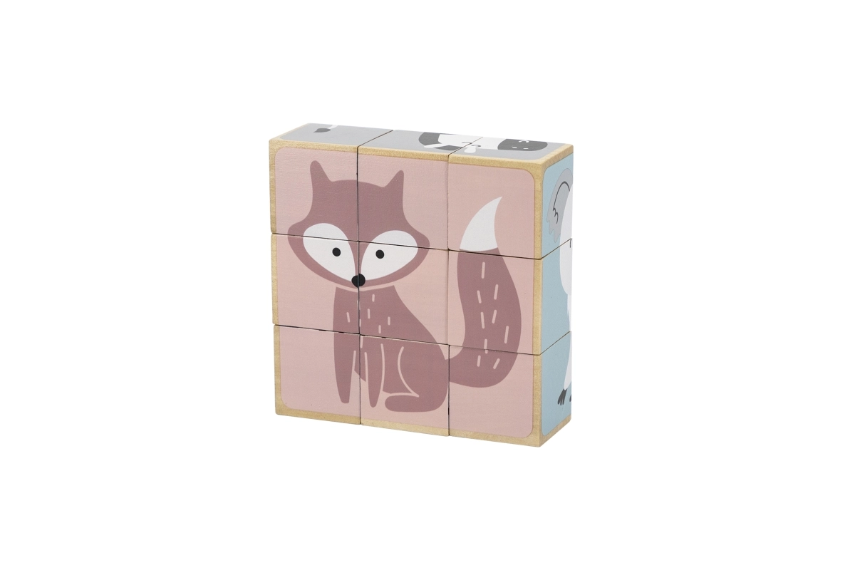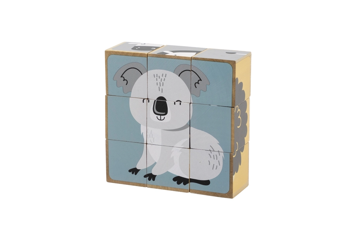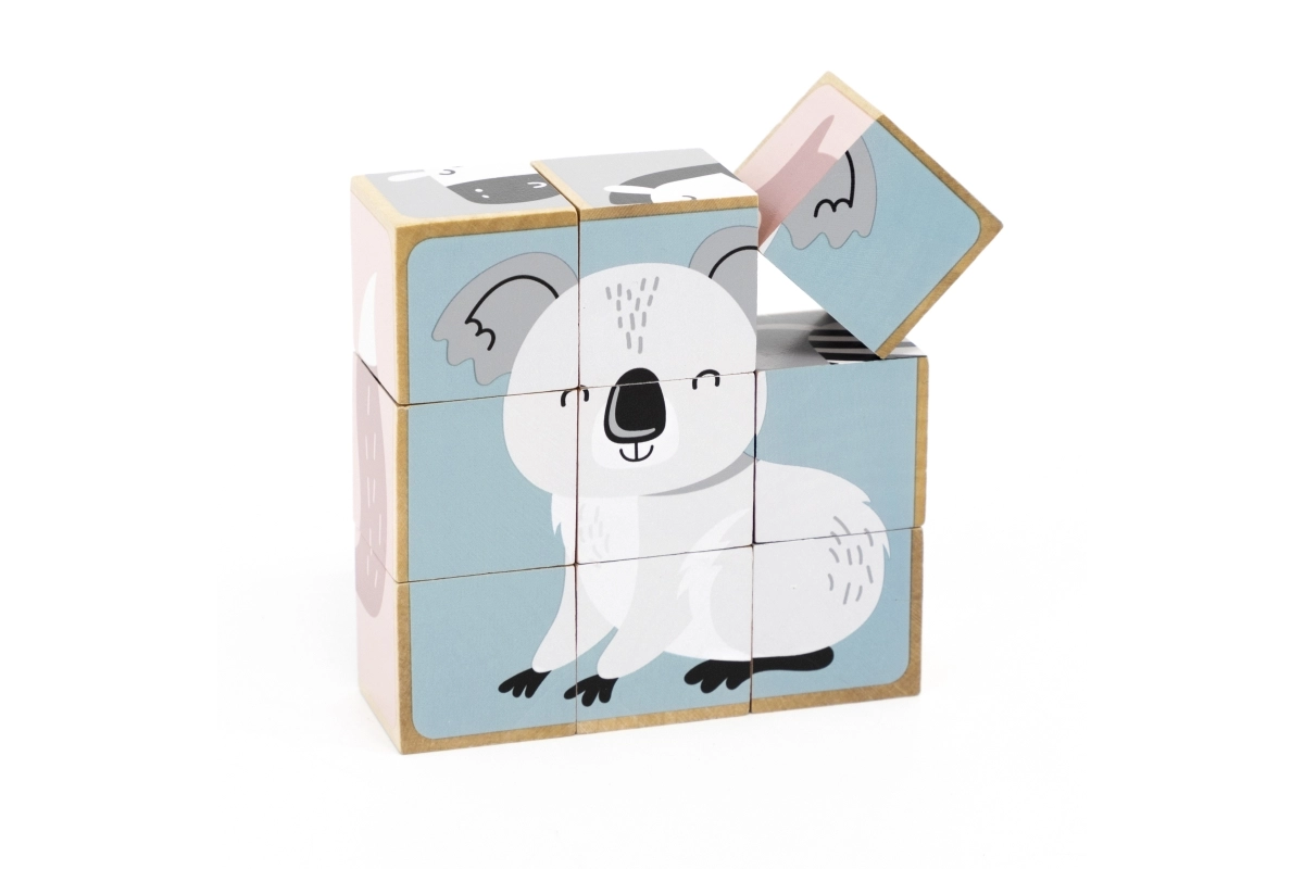 Atraskite laikui nepavaldų medinį žaislą, kuris ir džiugina, ir moko. Iš 9 kubelių sudėsite iš viso 6 skirtingus gyvūnėlių motyvus – pavyzdžiui, meškutį, lapę, koalą, zebrą ar ežiuką. Kiekviena kubelio pusė priklauso kitam paveikslėliui, todėl vaikai lavins dėmesį, kantrybę ir erdvinį mąstymą.