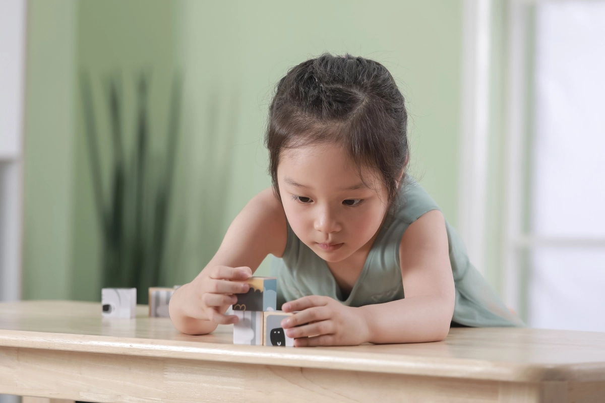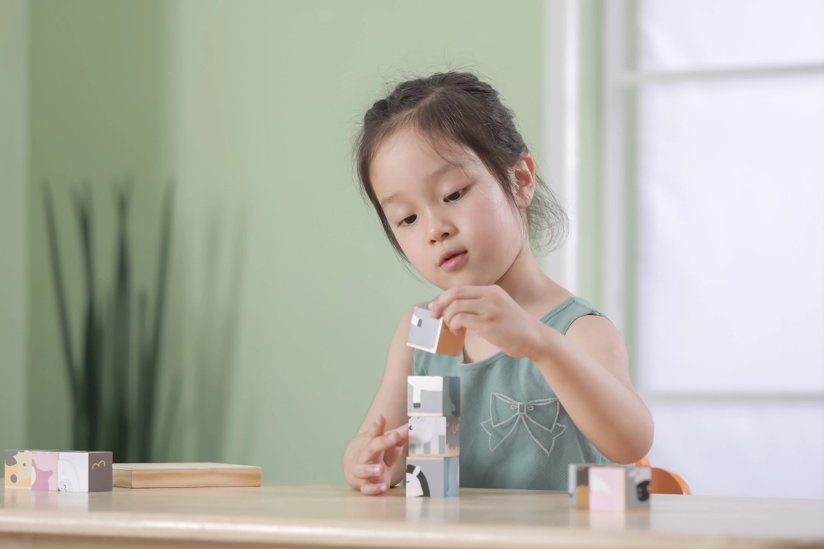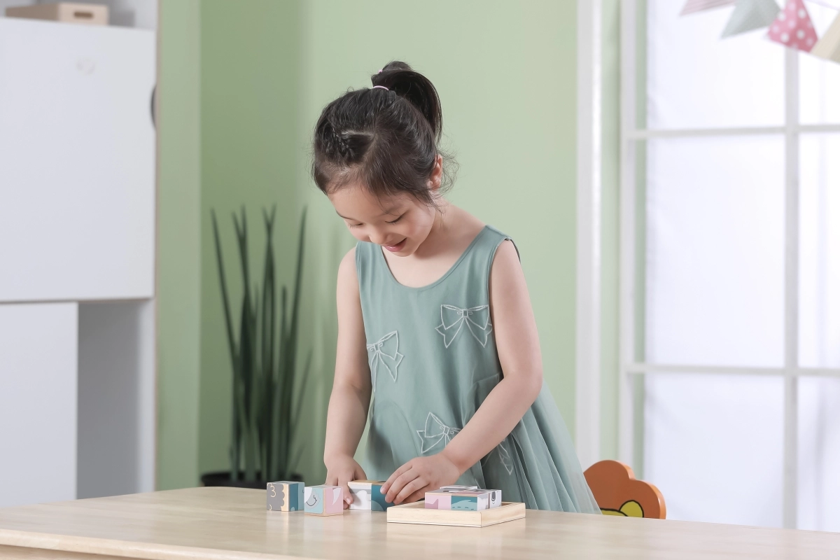 Žaidimas su kubeliais lavina smulkiąją motoriką, akių–rankų koordinaciją, kantrybę ir vizualinį suvokimą. Idealiai tinka pirmai loginei dėlionei.