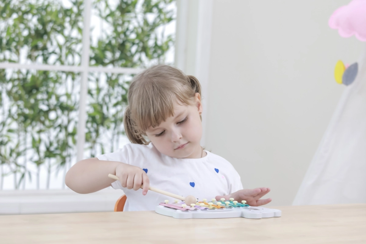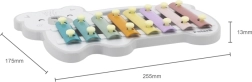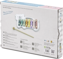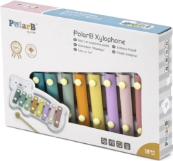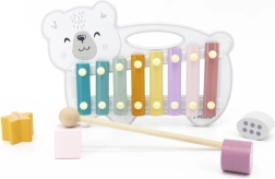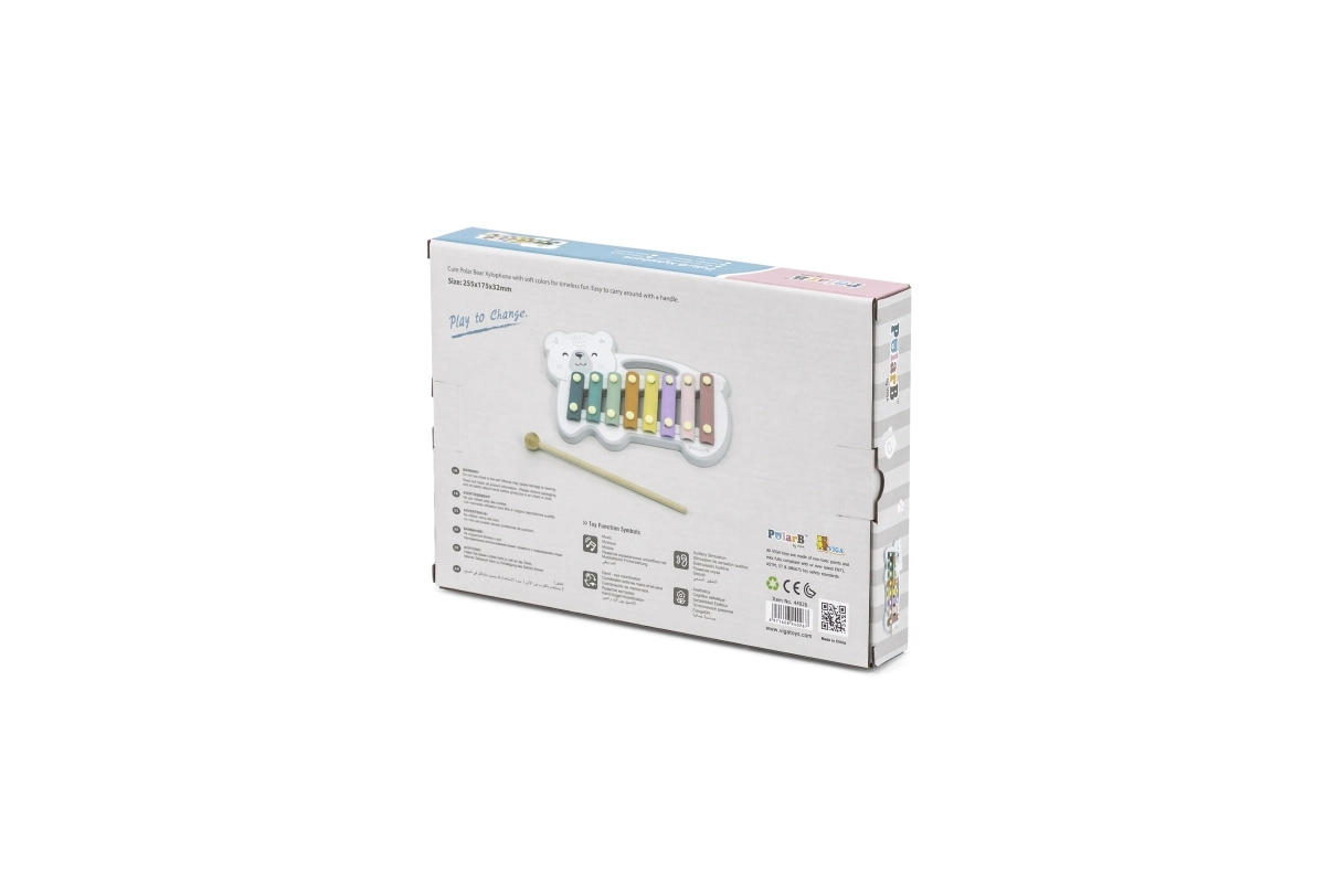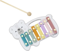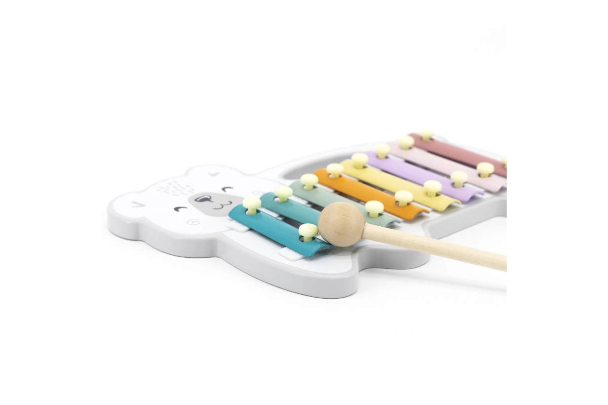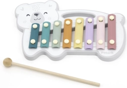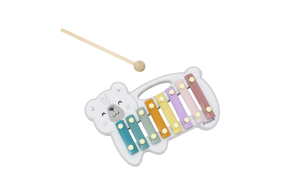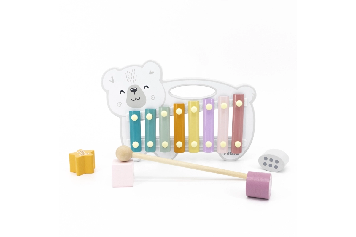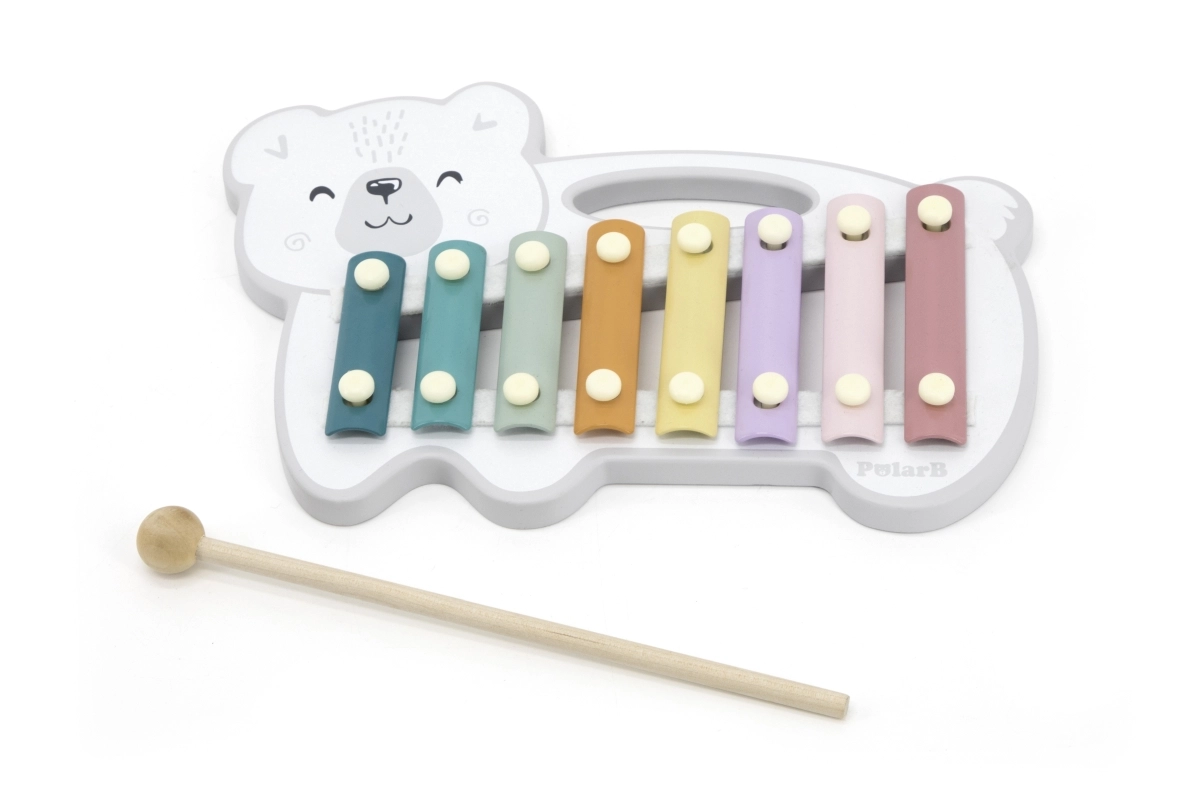 Medinis plokštutofonas, primenantis baltąjį lokį, derina žaismingą estetiką su funkcionaliu muzikos instrumentu. Pastelinės spalvos metalinės lamelės skleidžia malonius garsus mušant medine lazdele, natūraliai skatinant vaikus eksperimentuoti su skambesiais ir ritmu.