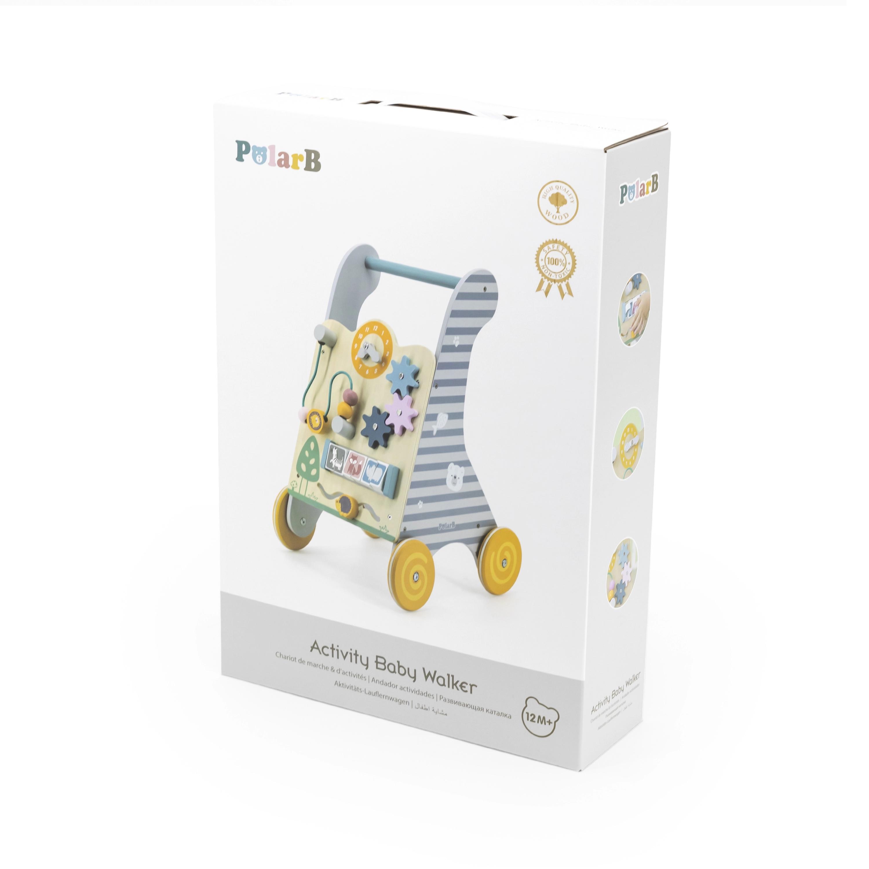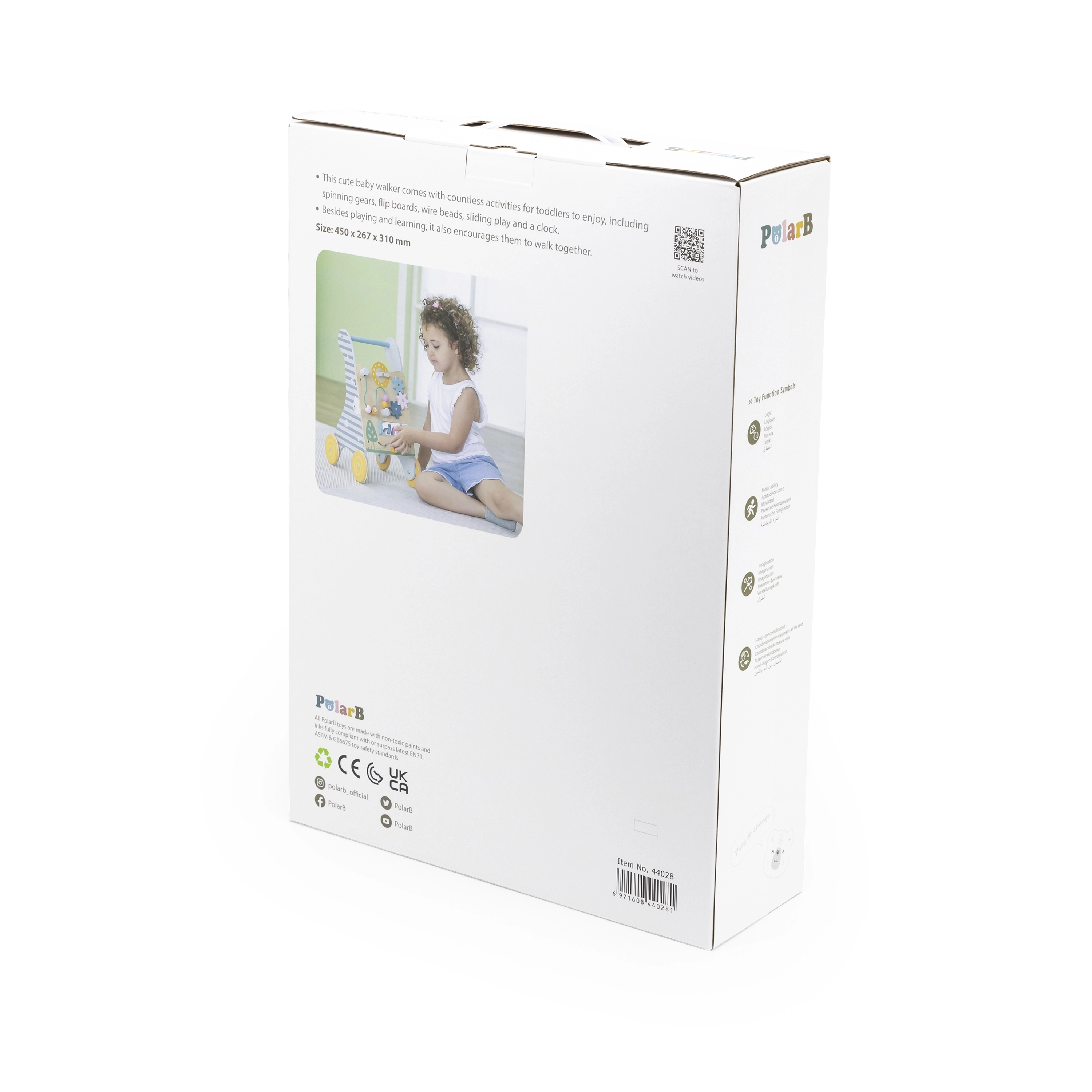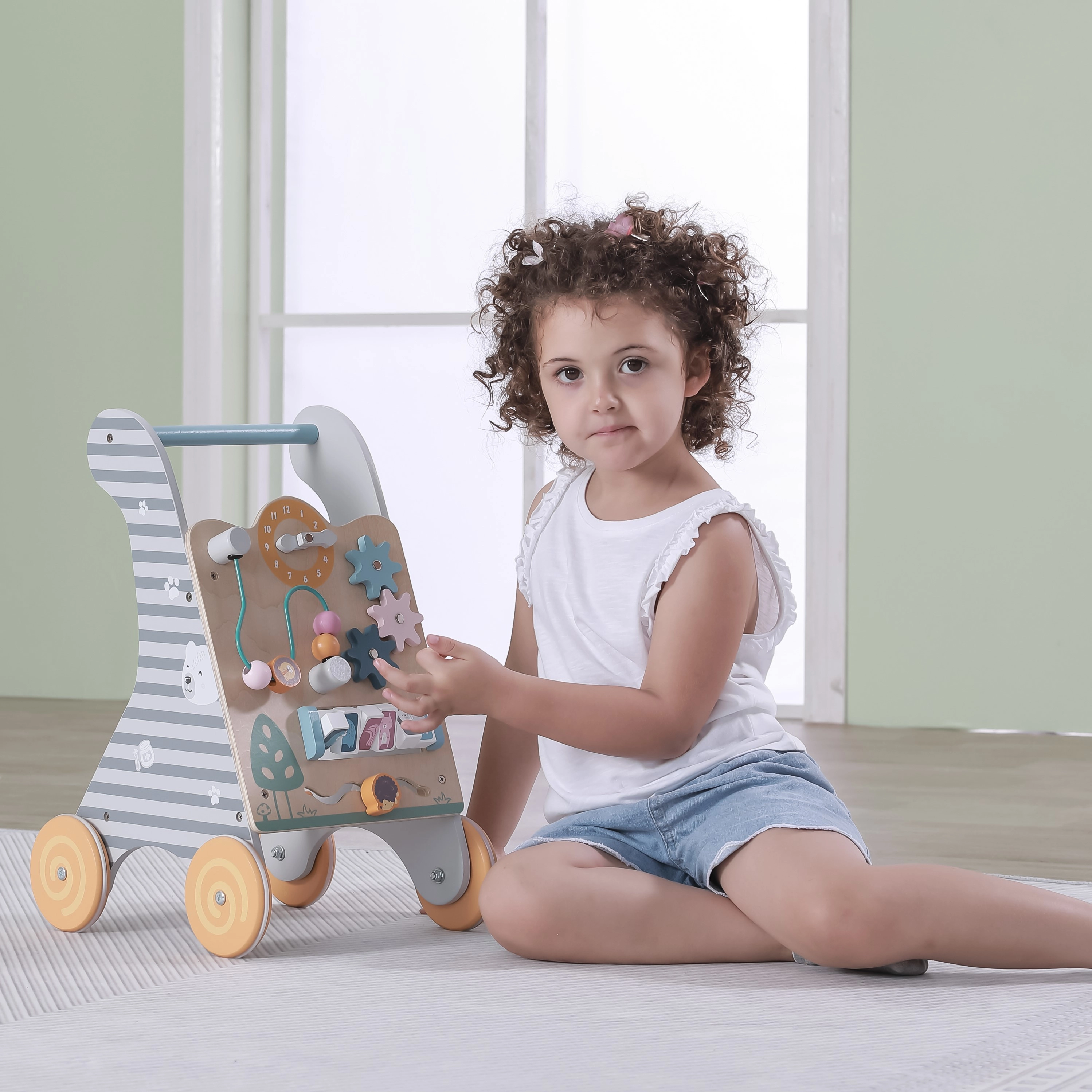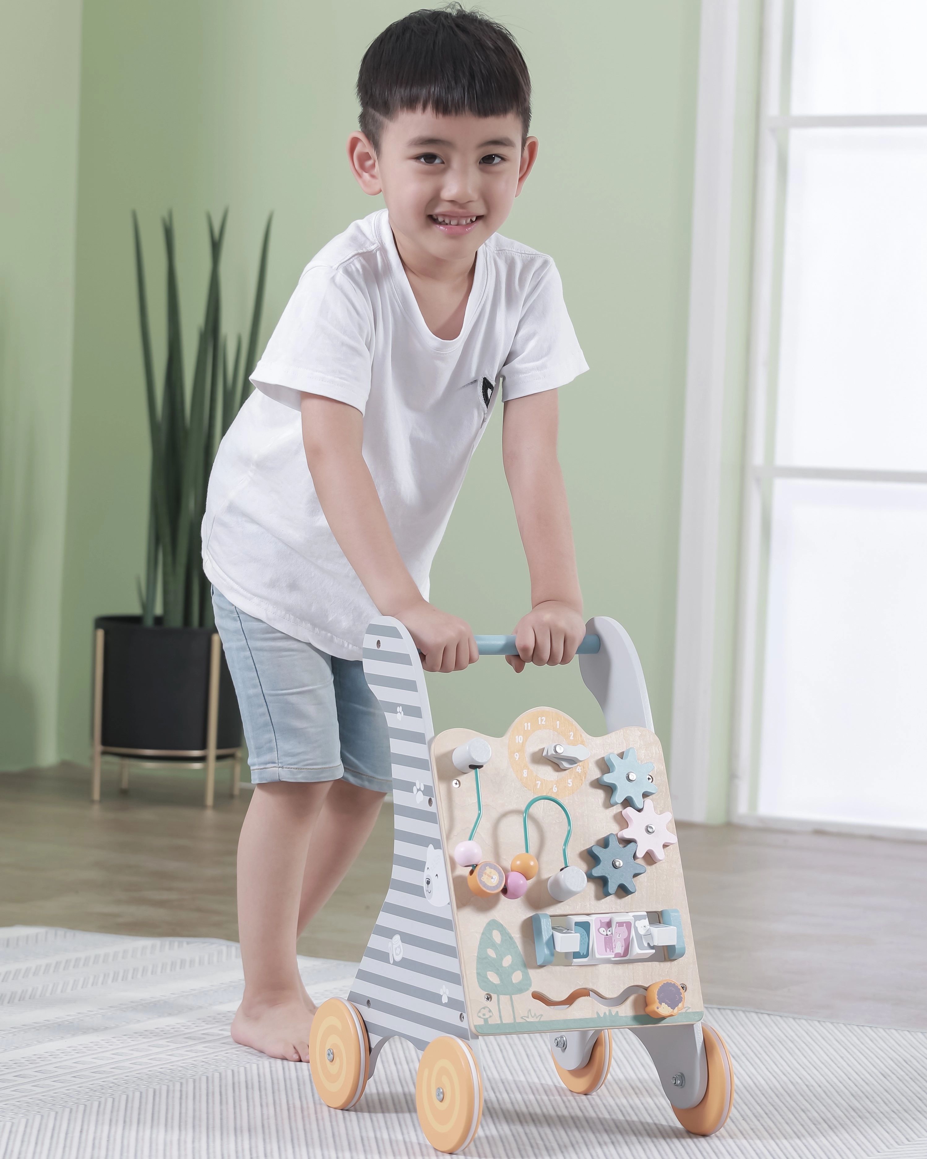 Saugumą ir stabilumą užtikrina platūs ratukai su neslystančia guma, kurie nebraižo grindų, ir medinė rankena patogiam bei saugiam suėmimui. Priekinėje panelėje yra: