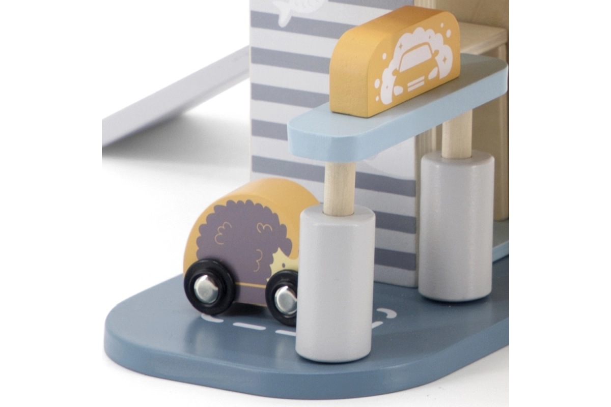 Medinis garažas siūlo daug interaktyvaus žaidimo galimybių dėl integruotų funkcijų, tokių kaip plovykla, degalinė ir liftas.