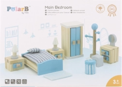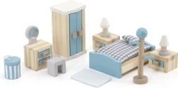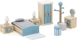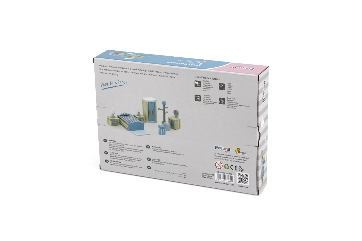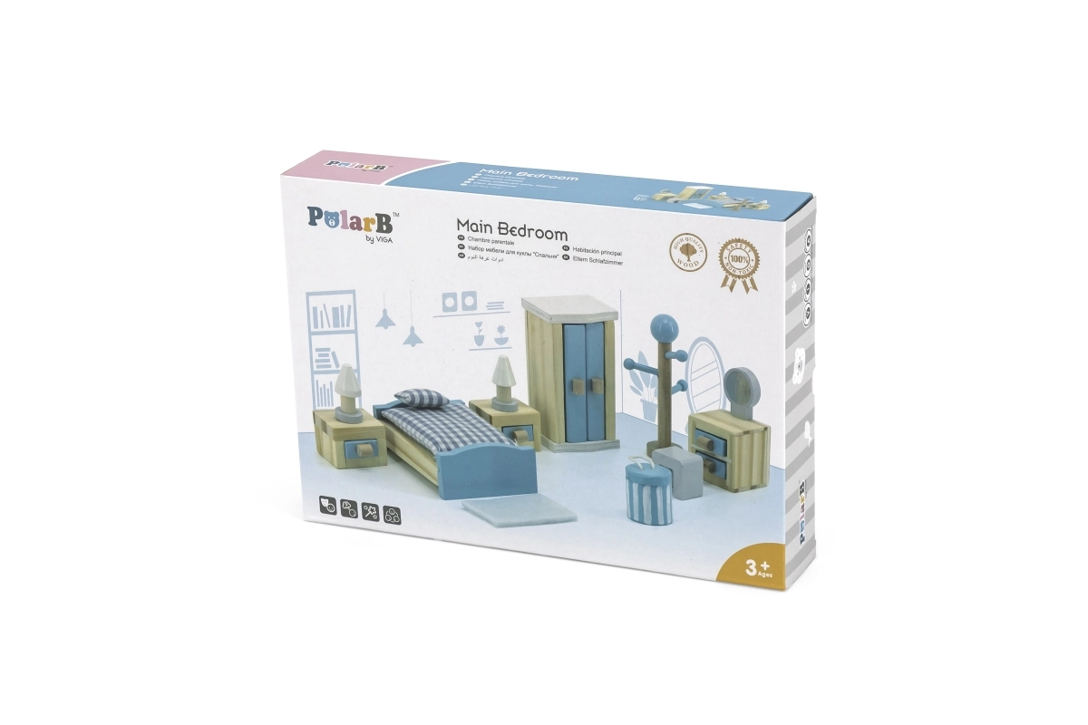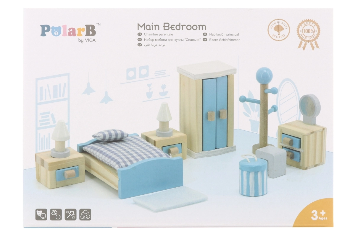 Medinis miegamasis VIGA POLARB pavers bet kurį lėlių namelį jaukia žaidimų erdve. Rinkinyje yra lova, 2 naktiniai staliukai, spinta, kabykla, tualetinis staliukas su taburete, kilimėlis ir krepšelis – viskas švelnių melsvų ir natūralių spalvų. Kokybiškas apdirbimas, lygūs kraštai ir netoksiški dažai užtikrina saugų žaidimą, o gausi komplektacija skatina vaikų fantaziją, kūrybiškumą ir vaidmenų žaidimus.