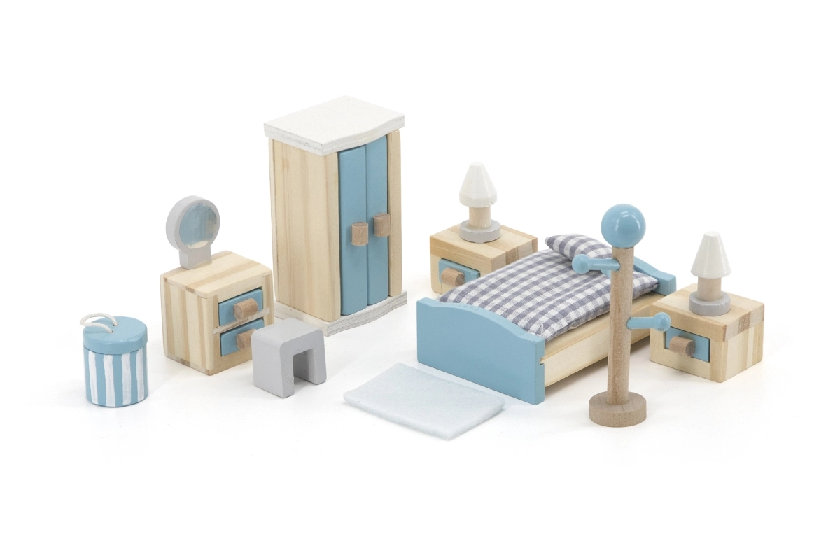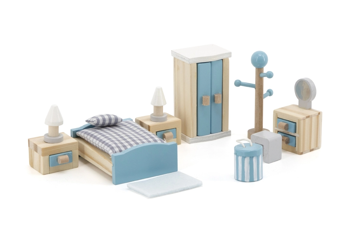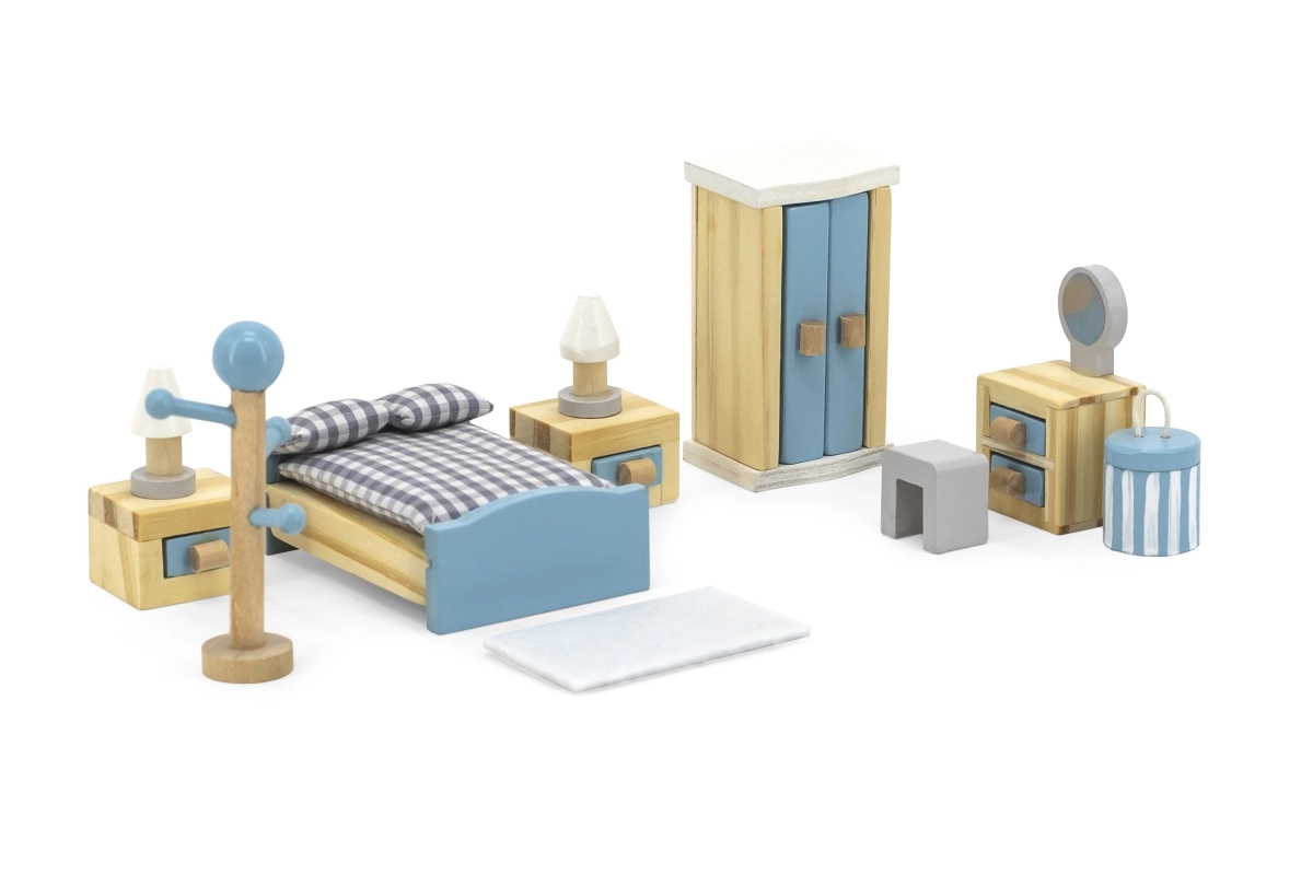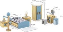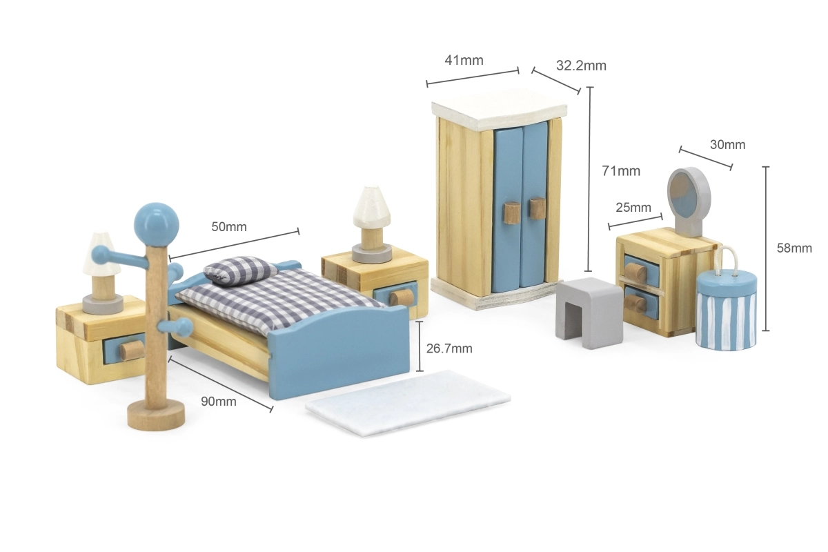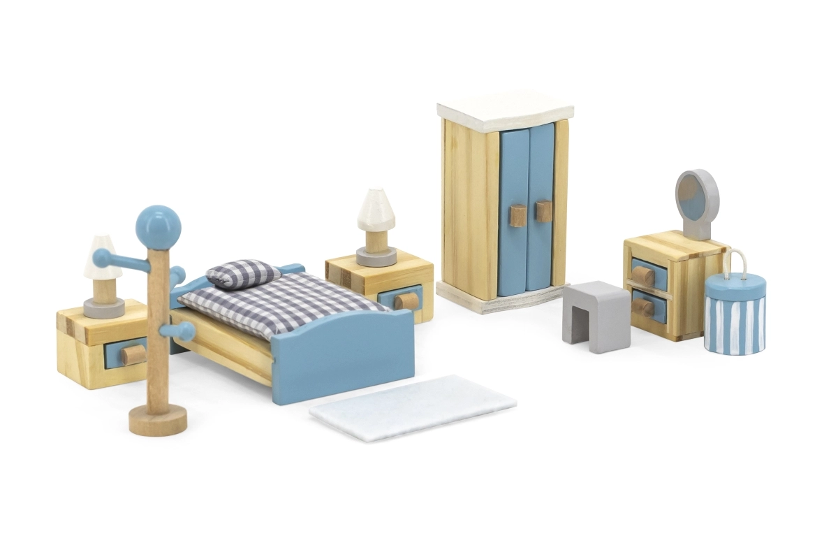 Šis apgalvotas medinių baldų rinkinys lėlių nameliui siūlo pilną miegamojo komplektaciją švelnių, vaikams malonių spalvų gama. Kiekviena detalė sukurta su dėmesiu smulkmenoms ir patvarumui, kad ilgai džiugintų ir lavintų vaikų vaizduotę.