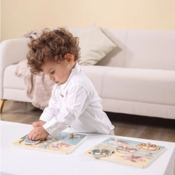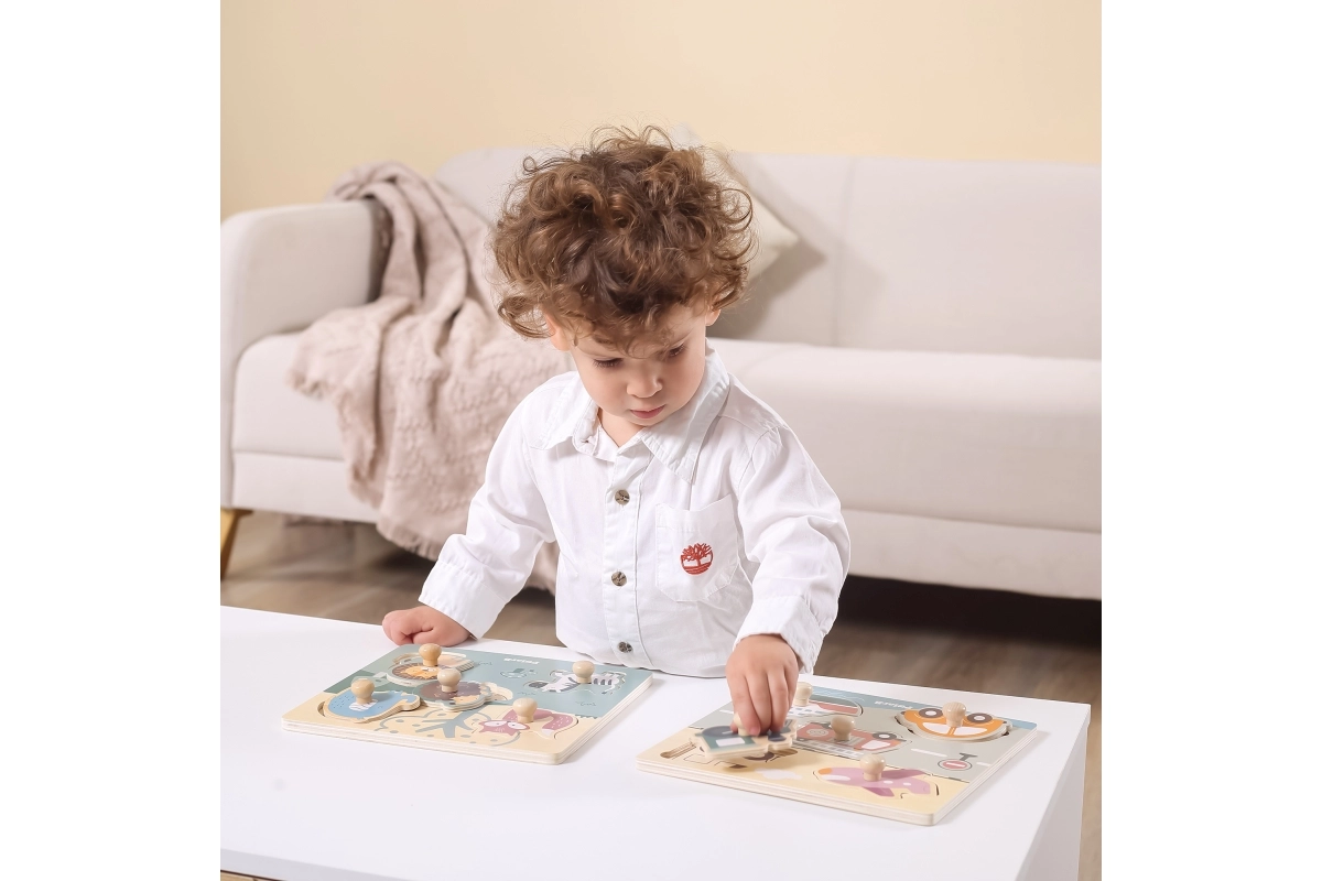 Kiekviena detalė turi patogią medinę „smeigtuką“, kuri palengvina manipuliavimą net patiems mažiausiems ir padeda lavinti smulkiąją motoriką.