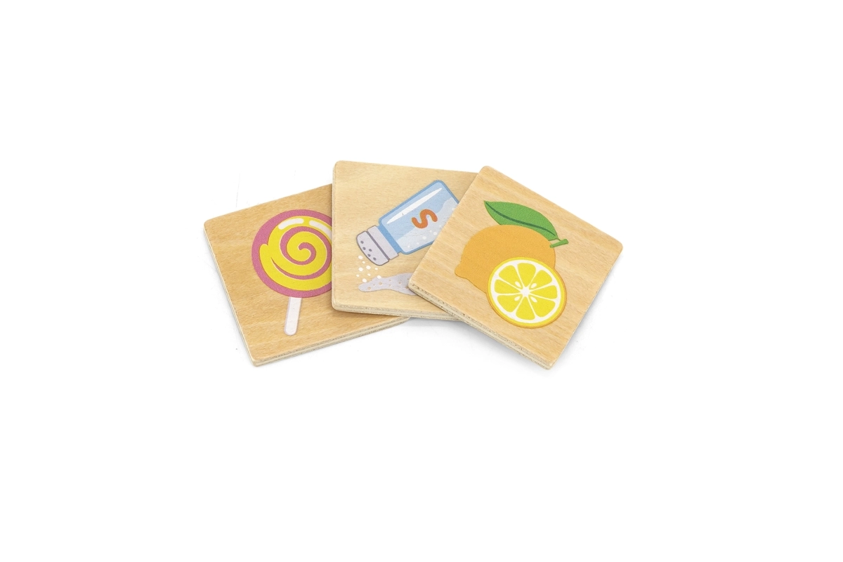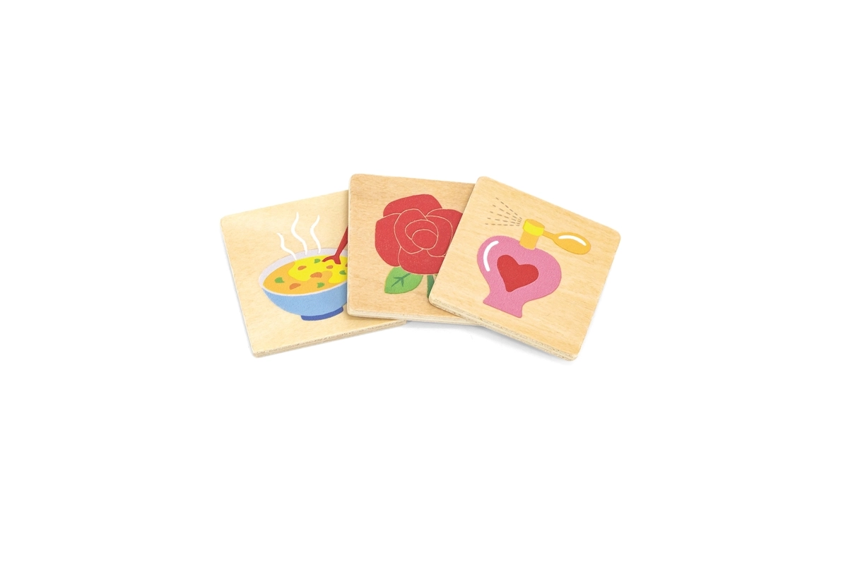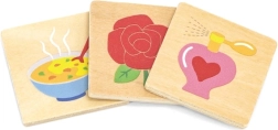Medinė dėlionė padeda vaikams mokytis per žaidimą ir lavinti gebėjimus atpažįstant skirtingus pojūčius.