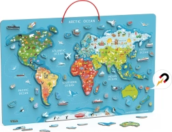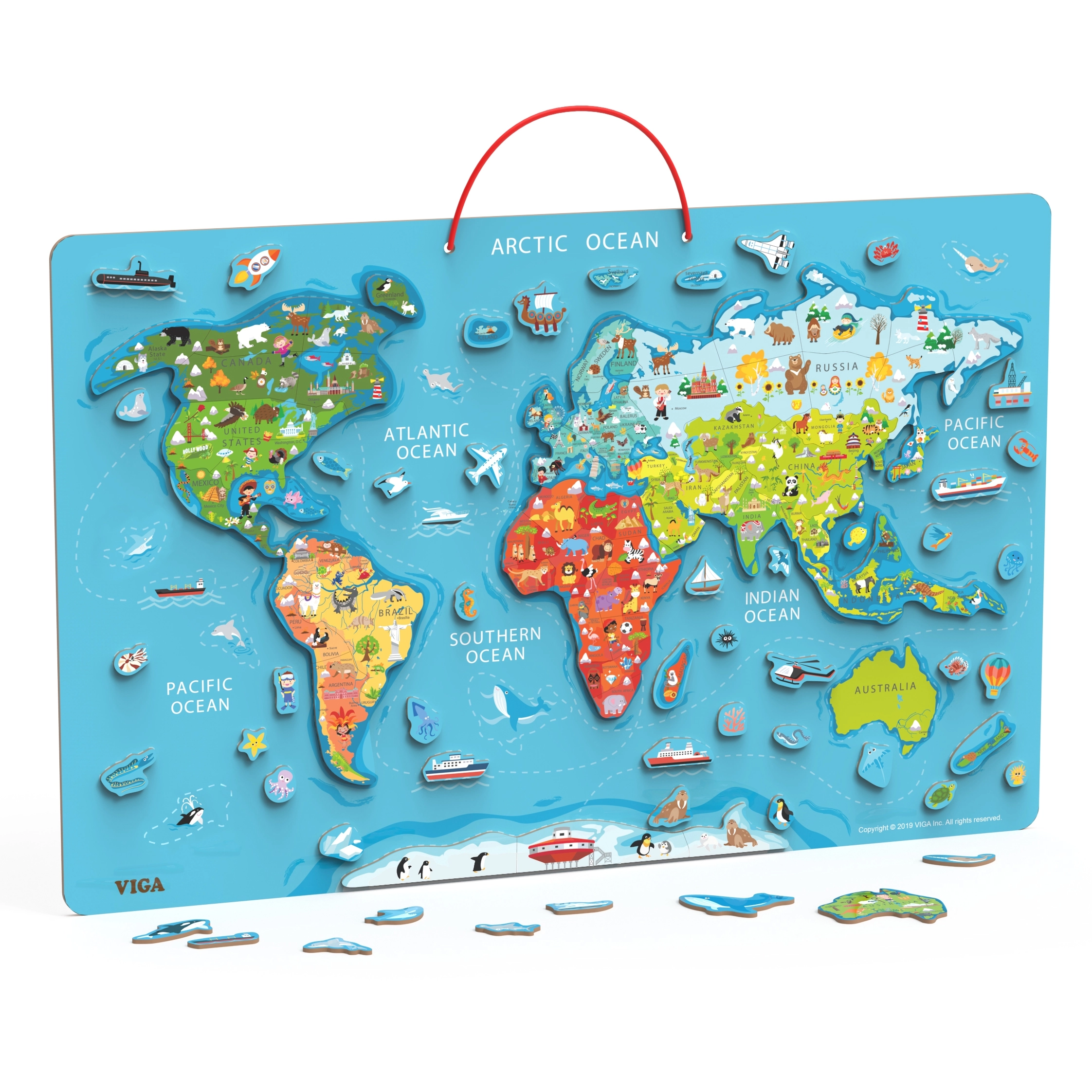 Žemėlapį sudaro 106 magnetinės dalys, vaizduojančios šalis, transporto priemones ir gyvūnus, kas palengvina geografijos mokymąsi.
