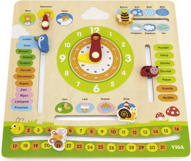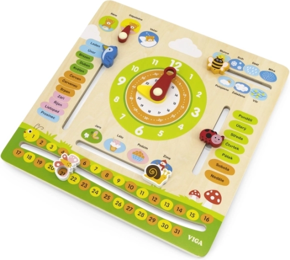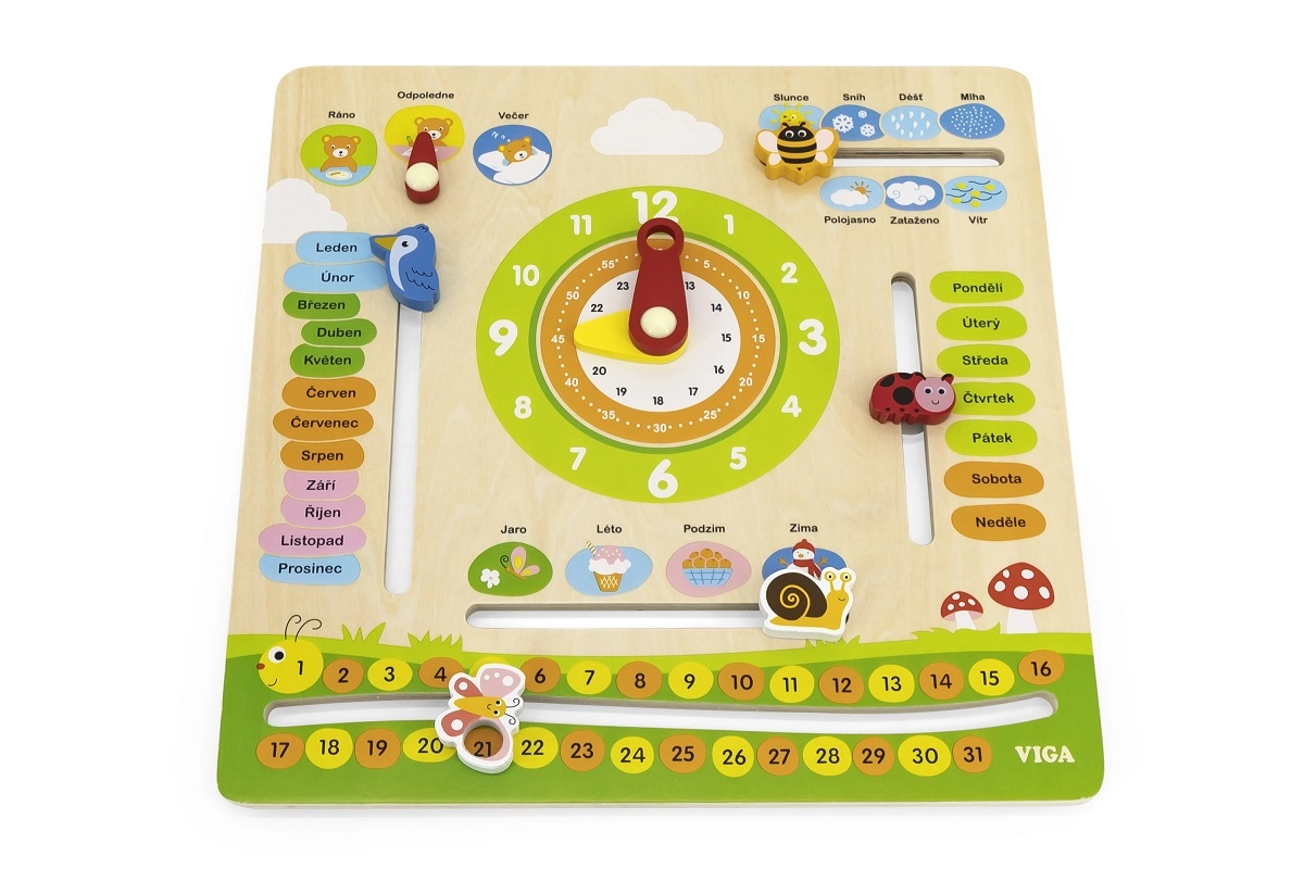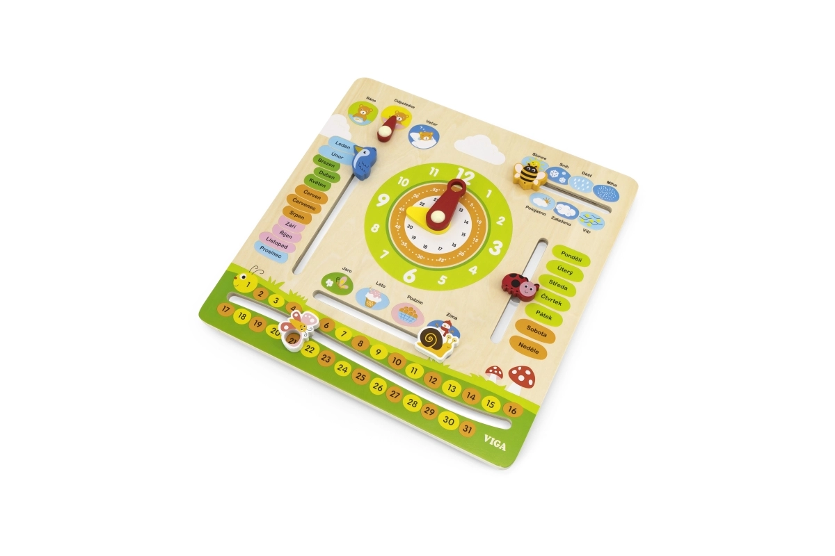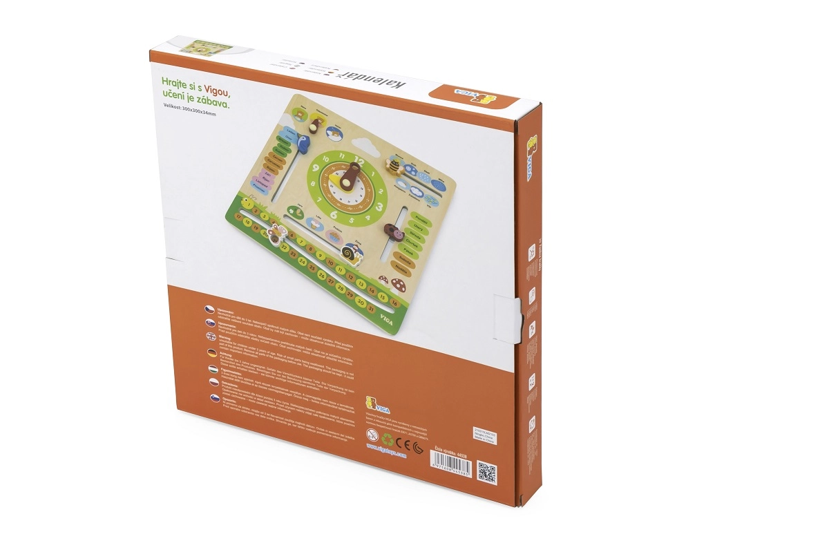 Išmanus ir smagus medinis VIGA kalendorius lietuvių kalba padeda vaikams žaismingai mokytis mėnesių, savaitės dienų, laikrodžio, metų laikų, oro, skaičių ir paros dalių. Judamos rodyklės ir žymekliai lavina smulkiąją motoriką ir skatina savarankišką atradimą.