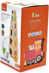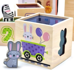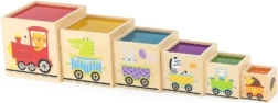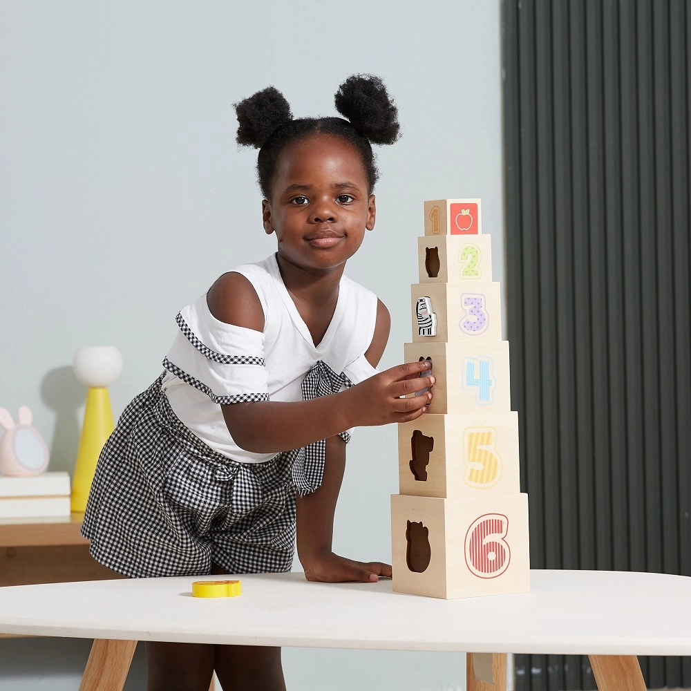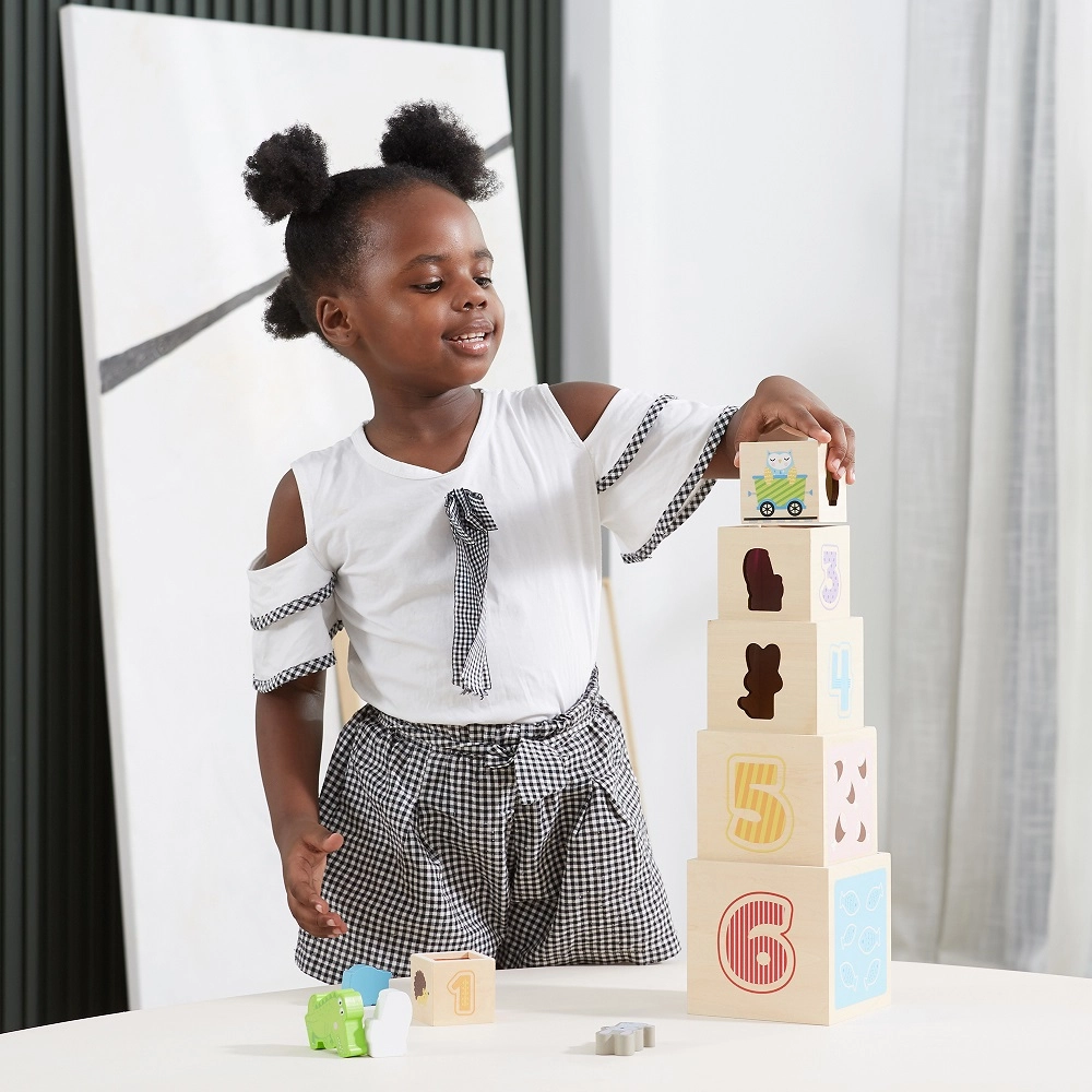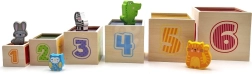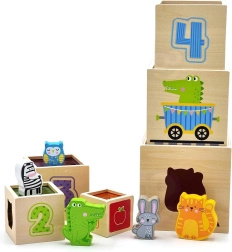 Ši nuostabi rinkinio sudėtis – šešios skirtingo dydžio kaladėlės, kurių kiekviena turi savitų motyvų. Vaikai mokosi atskirti skaičius, formas, spalvas, dydžius ir gyvūnus. Kaladėles galima lengvai sudėti vieną į kitą arba krauti vieną ant kitos, kas padeda suprasti išdėstymo ir eiliškumo sąvokas.