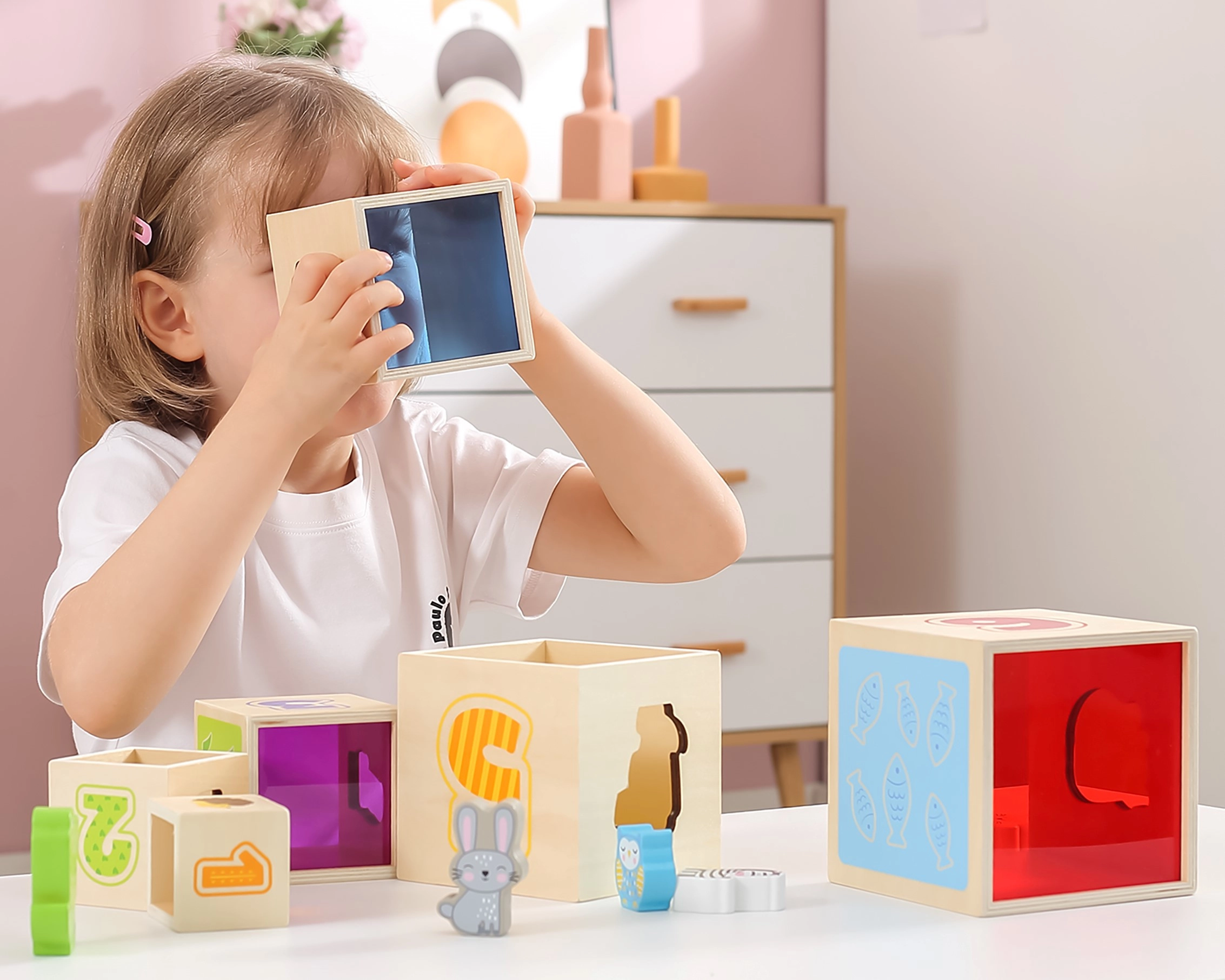 Kiekviena kaladėlė pažymėta skaičiais, formomis ir spalvomis, todėl vaikai mokosi pagrindinių pažintinių įgūdžių.