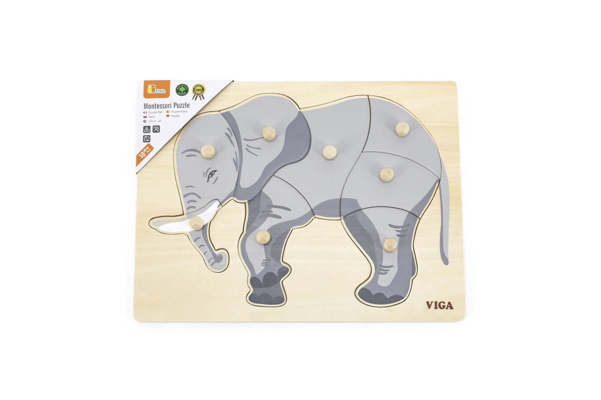 Medinis Montessori įdėklas Dramblys suteikia pramogą ir kartu lavina vaikų smulkiąją motoriką bei loginį mąstymą. Dėl rankenėlių ant kiekvieno detalių gabalėlio manipuliuoti lengva net patiems mažiausiems. Idealu vaikams nuo 18 mėnesių.