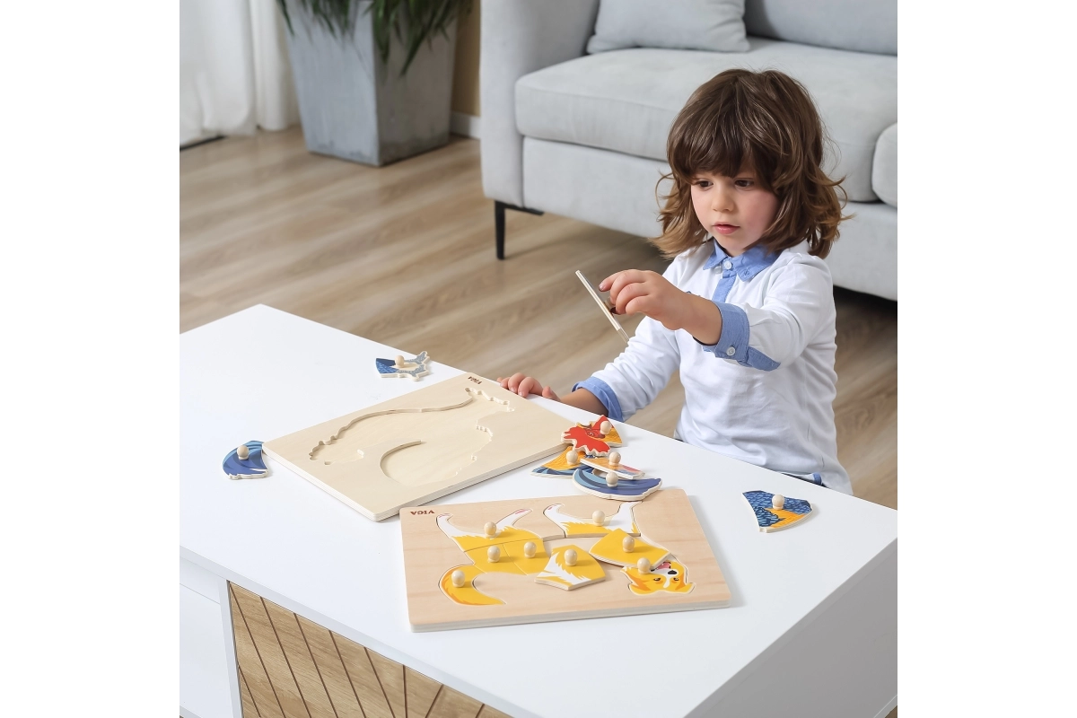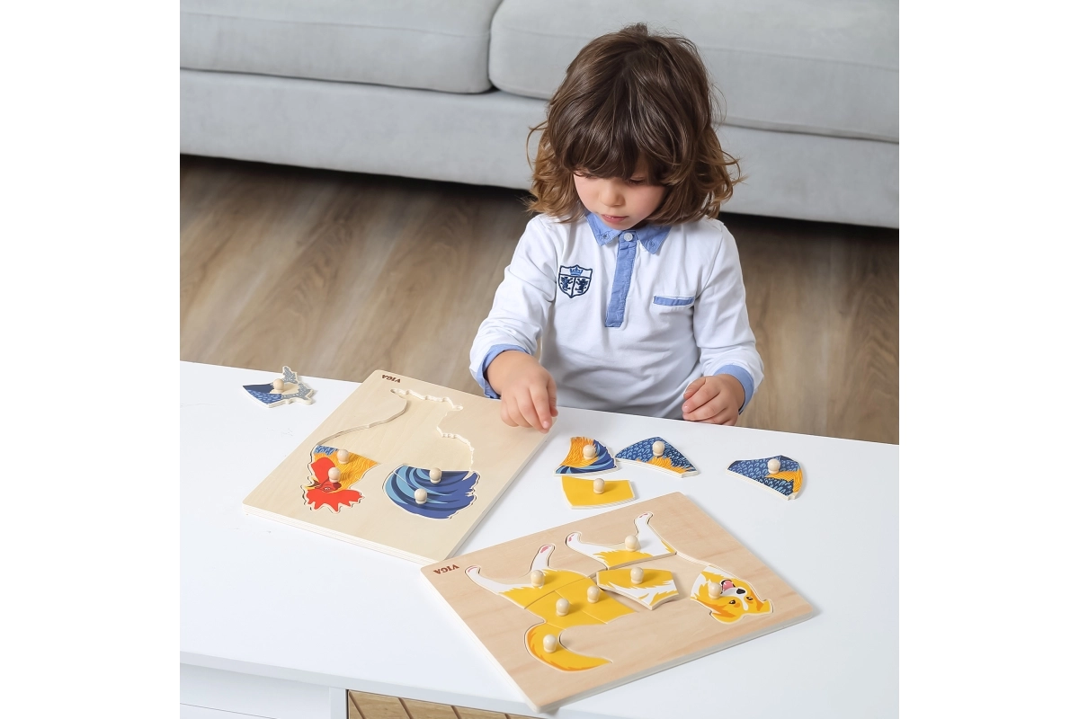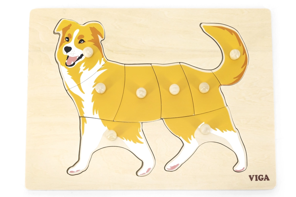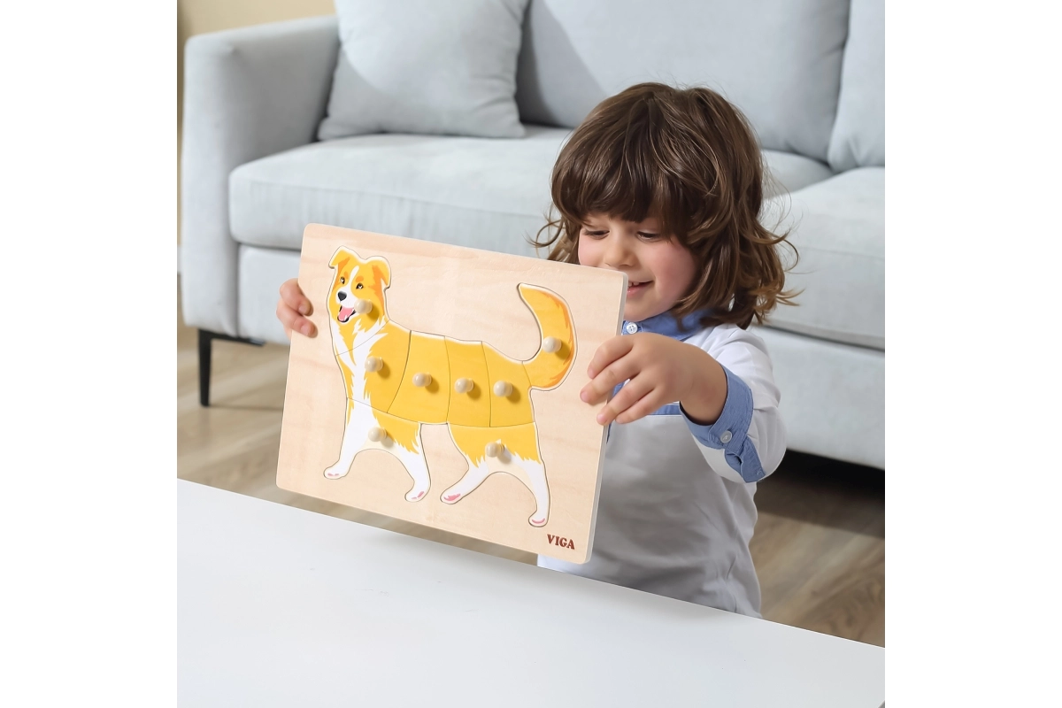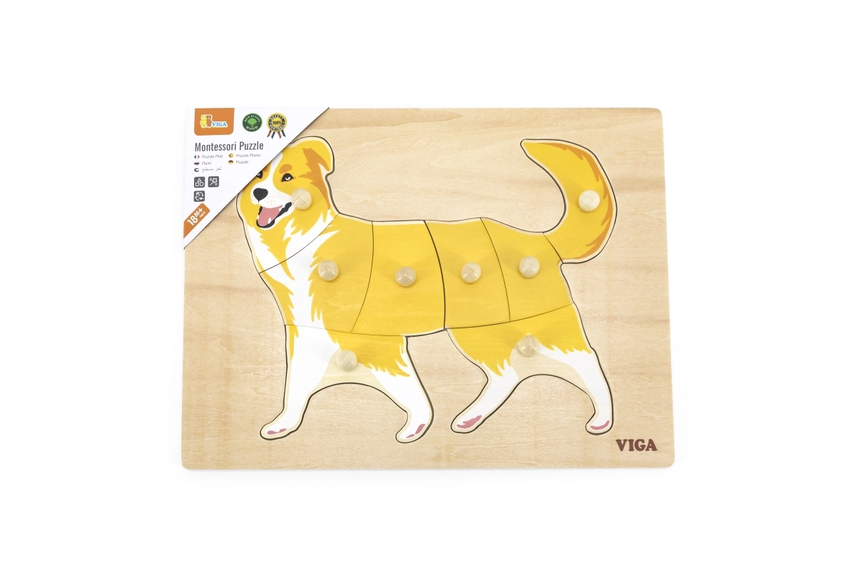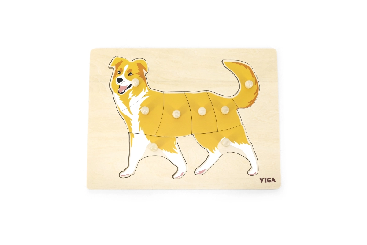 Pirmoji dėlionė vaikams nuo 18 mėn.: medinė montessori įstatyklė su šuns motyvu nuo VIGA. Dėl rankenėlių detales lengva laikyti, jos lavina smulkiąją motoriką, akies–ranka koordinaciją ir loginį mąstymą. Patvarus medis ir saugūs dažai. Lentos dydis 30 × 22,5 cm.