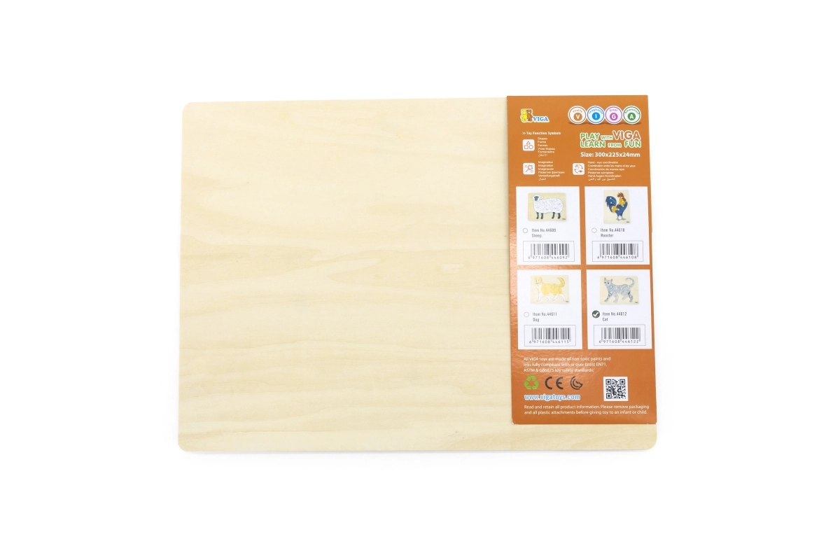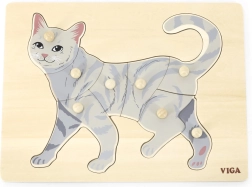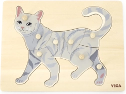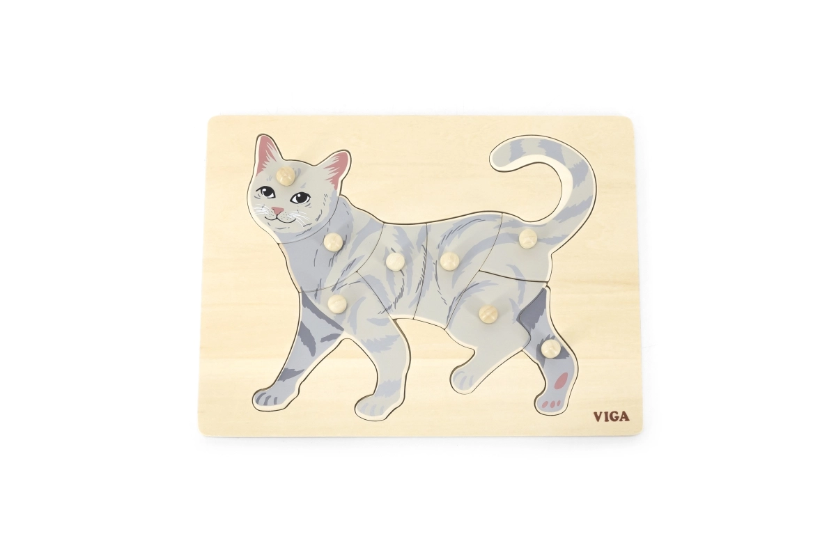 Vaiko užduotis – sudėti katės paveikslėlį ne tik pagal iliustraciją, bet ir pagal atskirų detalių formas. Mygtuko formos rankenėlės palengvina suėmimą mažais pirštukais ir padeda teisingai vesti ranką. Tvirta medinė lenta patikimai laiko detales vietoje ir atlaiko kasdienį naudojimą.