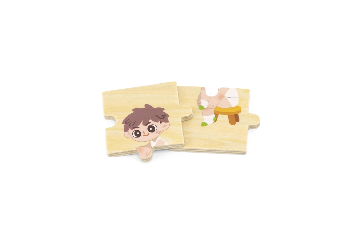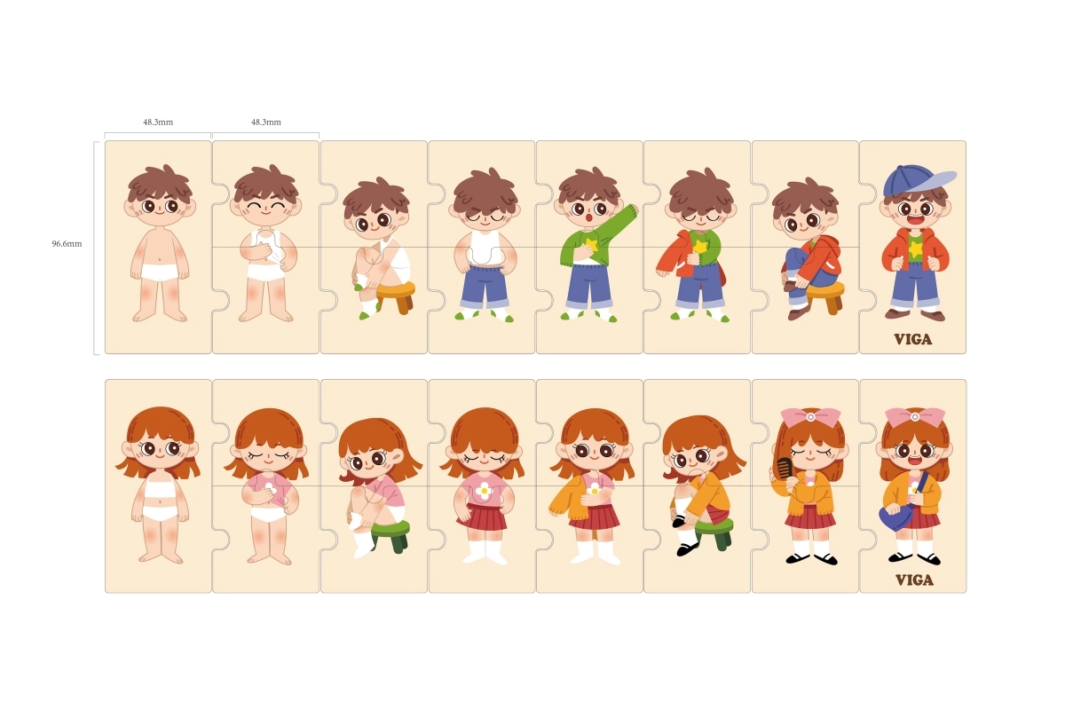 Šis kokybiškas medinis edukacinis žaislas moko vaikus teisingo apsirengimo eiliškumo dėliojant nuoseklias detales su berniuko ir mergaitės atvaizdais. Kiekviena detalė turi unikalų motyvą ir tiksliai susijungia, todėl žaisdami vaikai lavina suvokimą apie ryšius ir kantrybę.