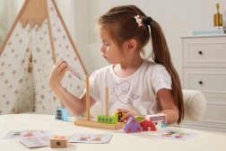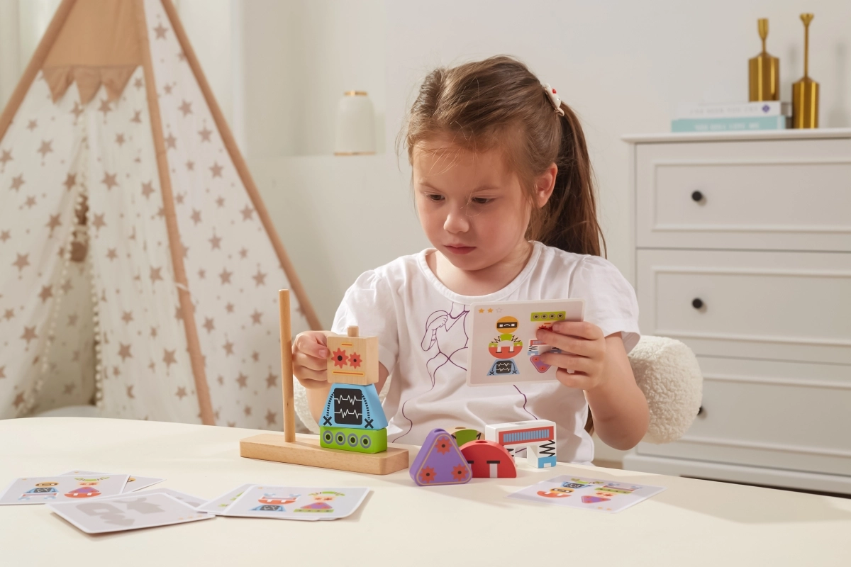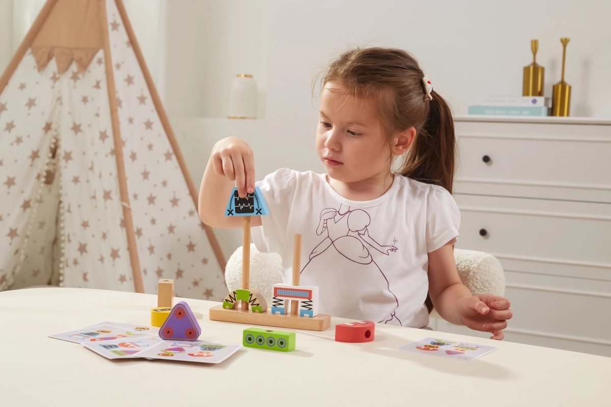 Rinkinyje yra kortelės su įvairiais raštais – vaikai lavina loginį mąstymą, dėmesį ir tikslumą dėliodami žingsnis po žingsnio.