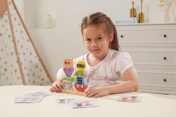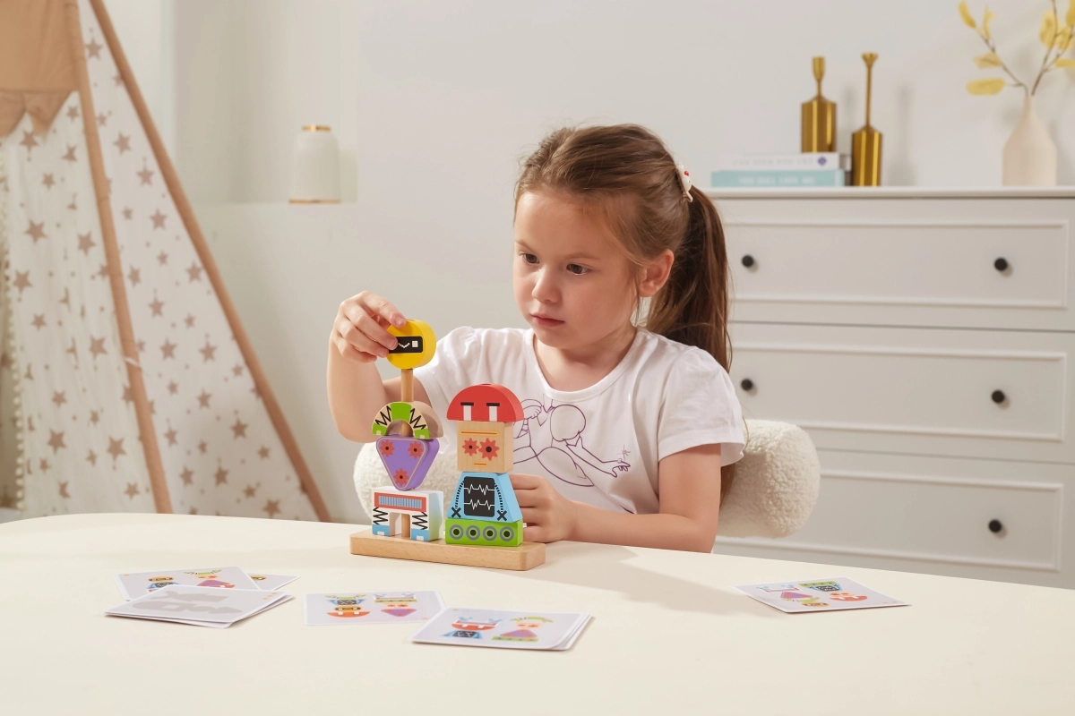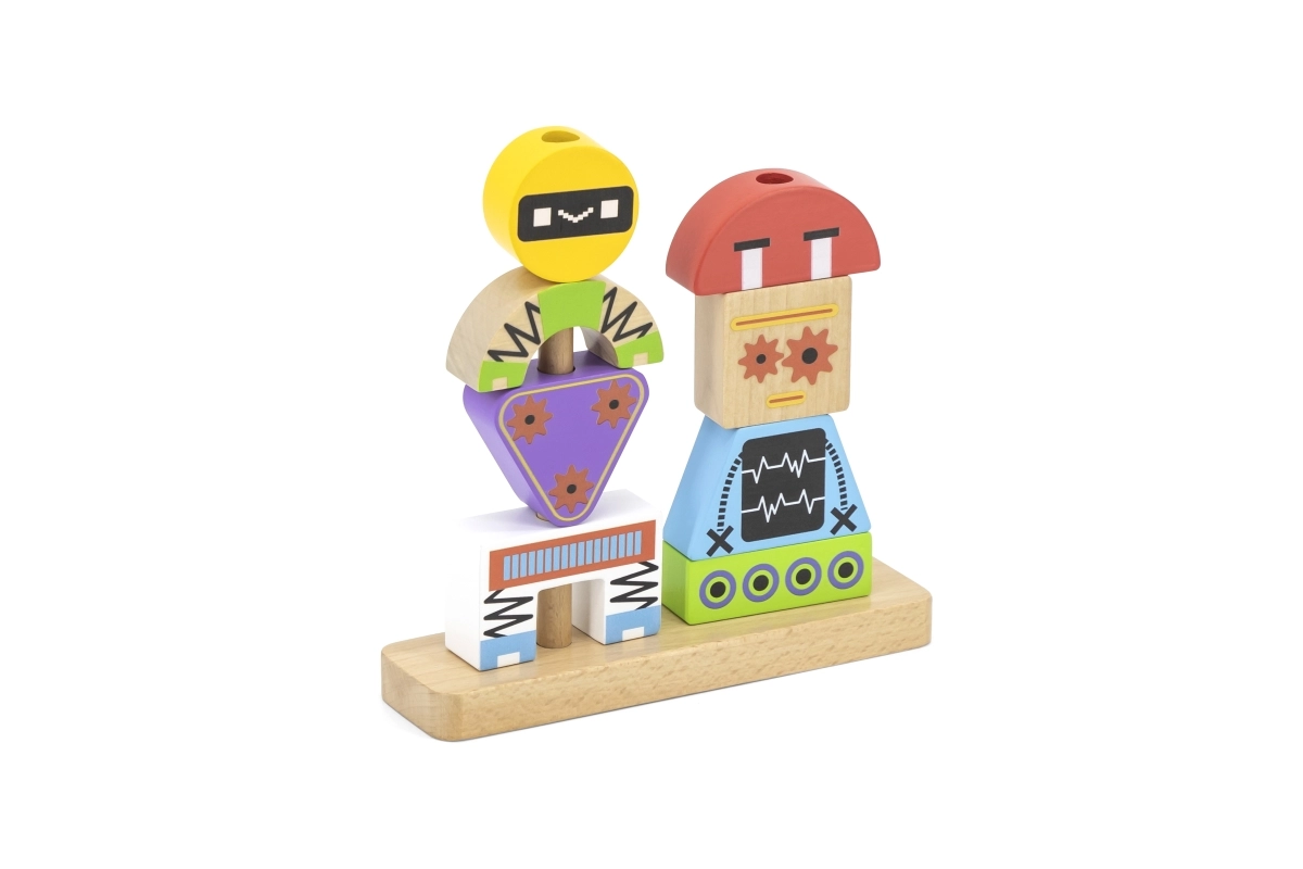 Atraskite išmintingą žaislą, augantį kartu su vaiku. Medinės detalės įvairių formų ir spalvų lengvai maunamos ant pagrindo kaištelių ir leidžia konstruoti įvairius robotų personažus. Pridėtos pavyzdžių kortelės veda nuo paprastų iki sudėtingesnių kombinacijų, ugdo susikaupimą ir kantrybę.
