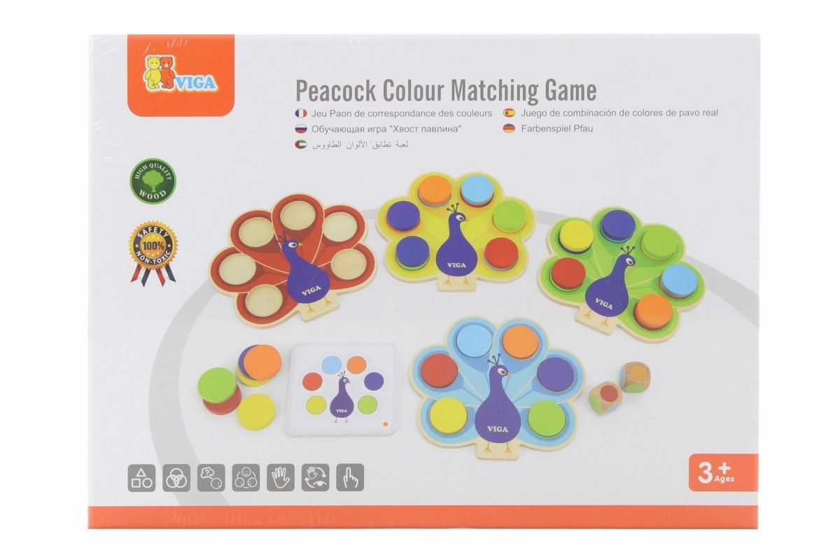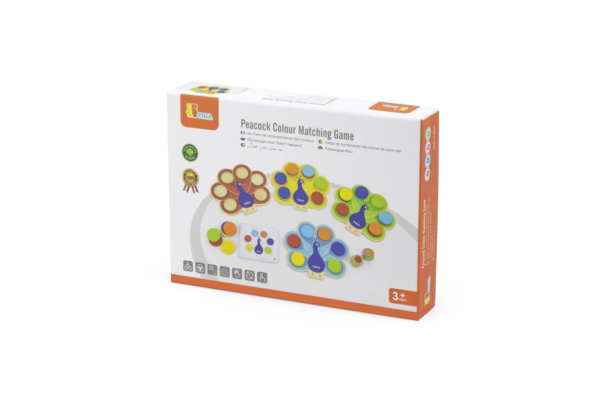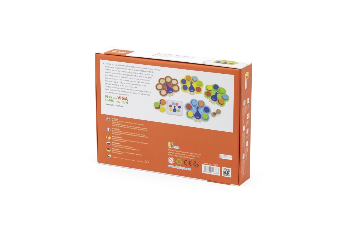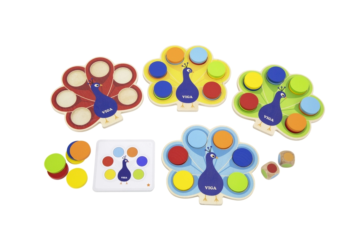 Vaikiškas edukacinis žaidimas VIGA povas linksmai moko atpažinti spalvas, lavina smulkiąją motoriką ir akies–rankos koordinaciją. Spalvoti diskai dedami į povo uodegą pagal korteles arba metant spalvotą kauliuką – idealiai tinka Montessori mokymuisi, susikaupimui ir bendram žaidimui.