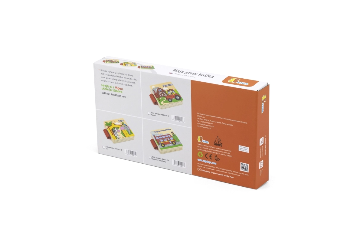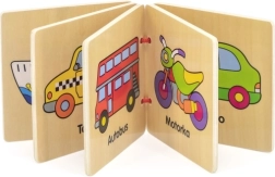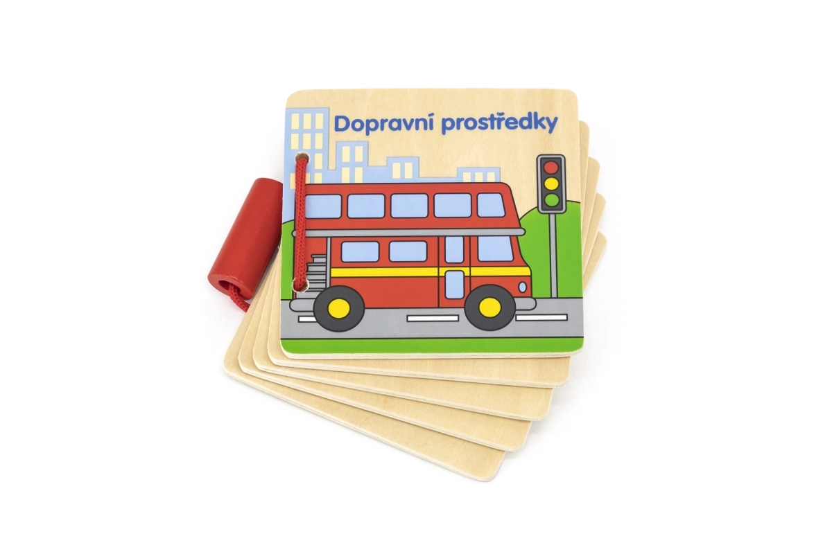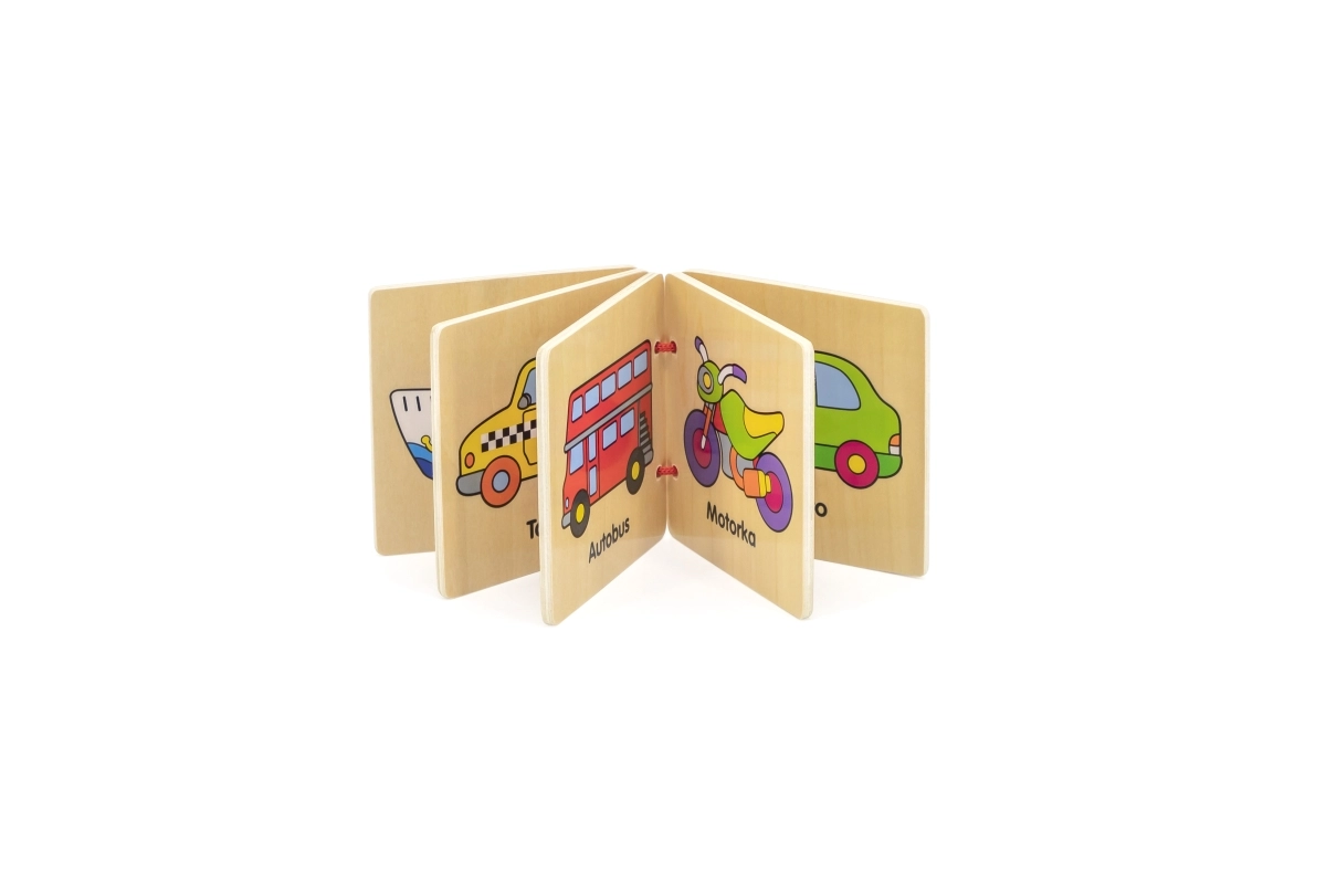 Atraskite pirmąjį skaitymą patiems mažiausiems: medinė knygelė su paveikslėliais ir transporto priemonių pavadinimais čekų kalba. Patvarūs mediniai lapeliai, lengvas vertimas ir saugus dizainas vaikams nuo 12 mėnesių padeda lavinti žodyną ir smulkiąją motoriką.
