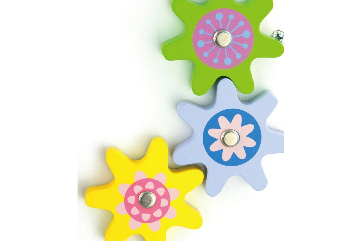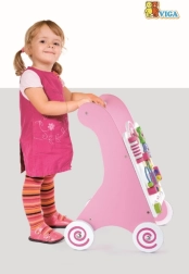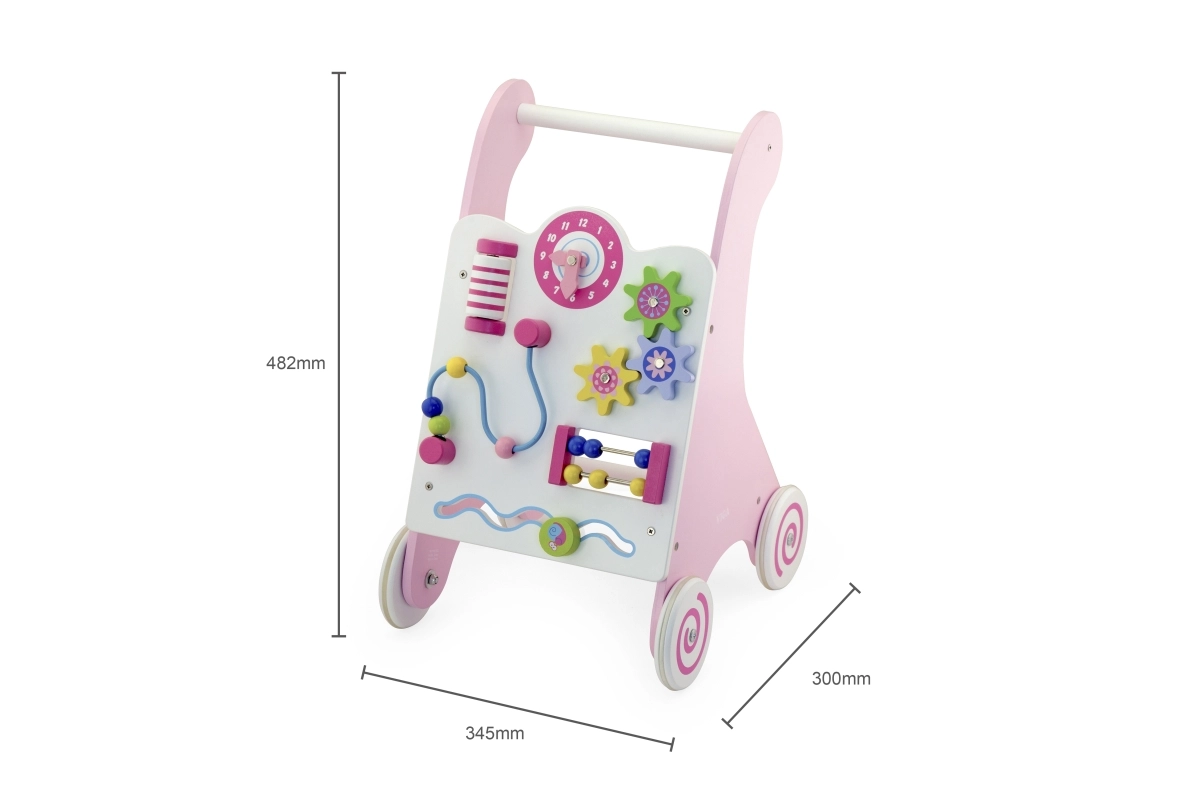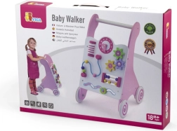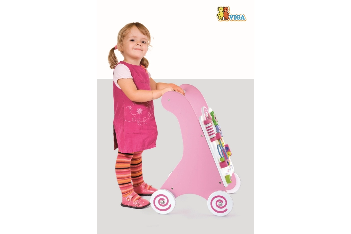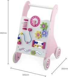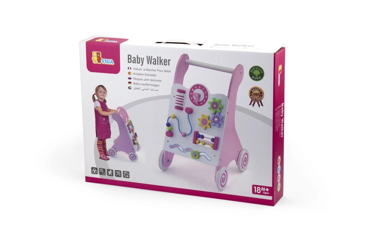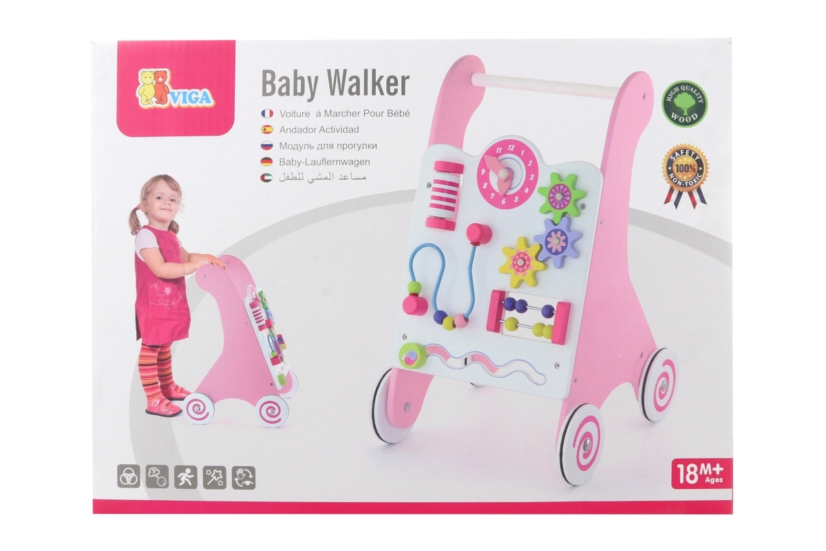 Vaikštynė aprūpinta guminiais ratukais, kurie neleidžia slysti ir užtikrina saugumą vaikštant. Visa žaislas pagamintas iš lakuotos medienos, kas suteikia šiltą ir natūralų pojūtį, kartu yra labai atsparus dėvėjimuisi. Supakuota į spalvotą dėžę su rankenomis, yra ideali dovanai.