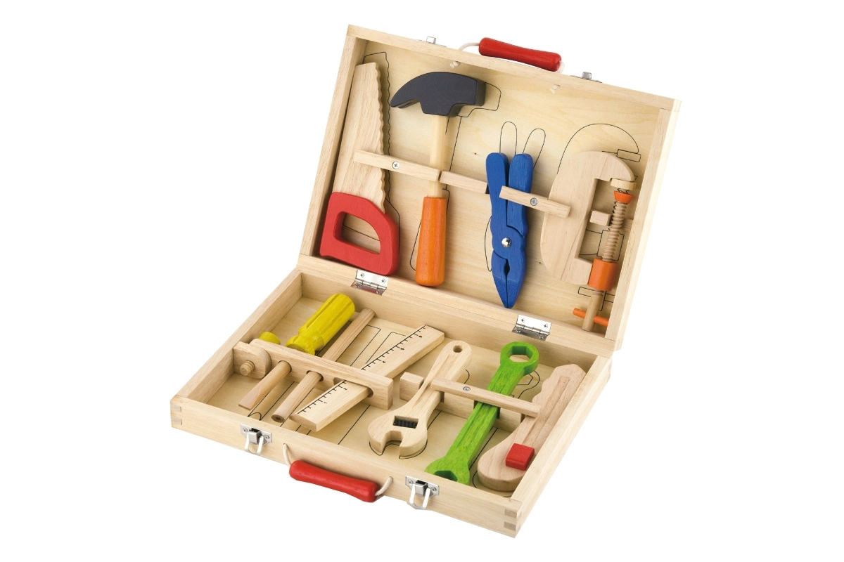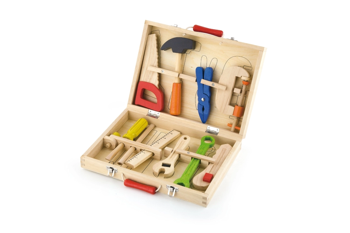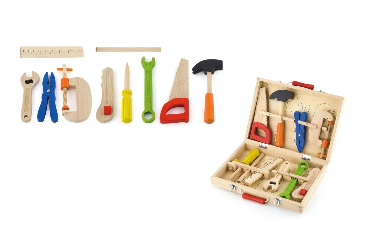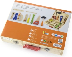 Suteikite vaikams tikrovišką žaidimo patirtį su kruopščiai pagamintais mediniais įrankiais patogiame lagaminėlyje. Rinkinyje yra plaktukas, pjūklelis, raktas, atsuktuvas ir kiti mėgstami įrankiai, padedantys lavinti miklumą ir vaizduotę. Dėl medinės konstrukcijos žaislas yra patvarus, malonus liesti ir saugus mažoms rankytėms.