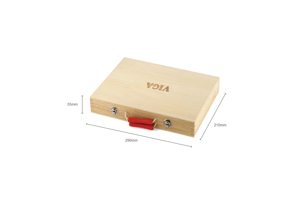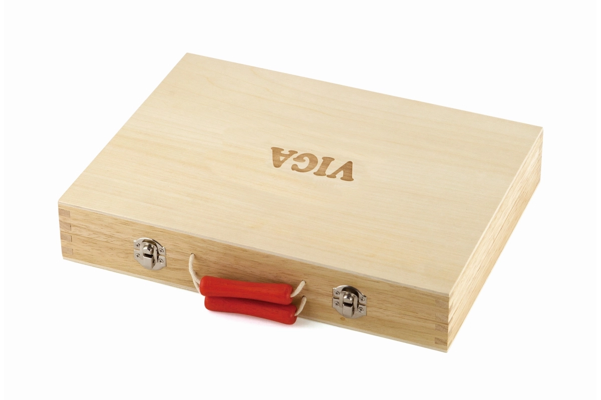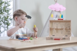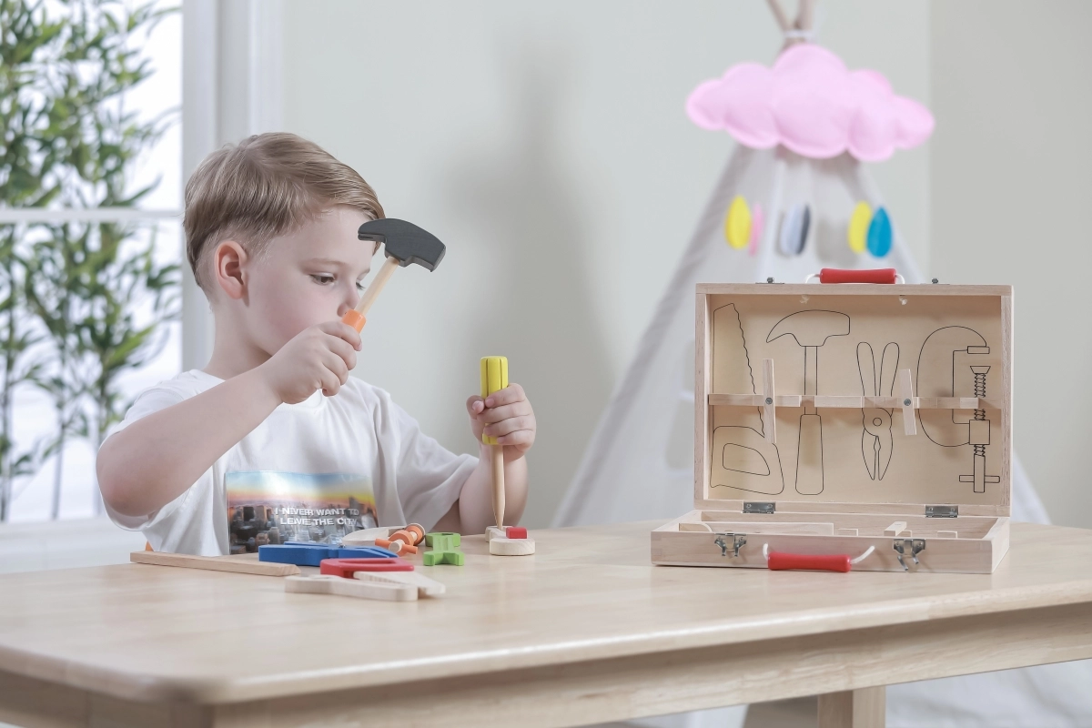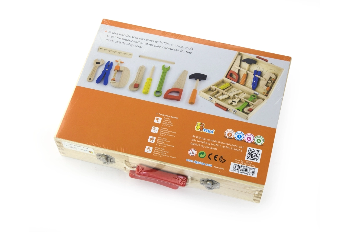 Suteikite vaikams tikrovišką žaidimo patirtį su kruopščiai pagamintais mediniais įrankiais patogiame lagaminėlyje. Rinkinyje yra plaktukas, pjūklelis, raktas, atsuktuvas ir kiti mėgstami įrankiai, padedantys lavinti miklumą ir vaizduotę. Dėl medinės konstrukcijos žaislas yra patvarus, malonus liesti ir saugus mažoms rankytėms.