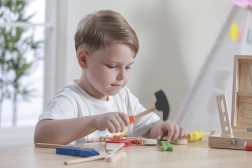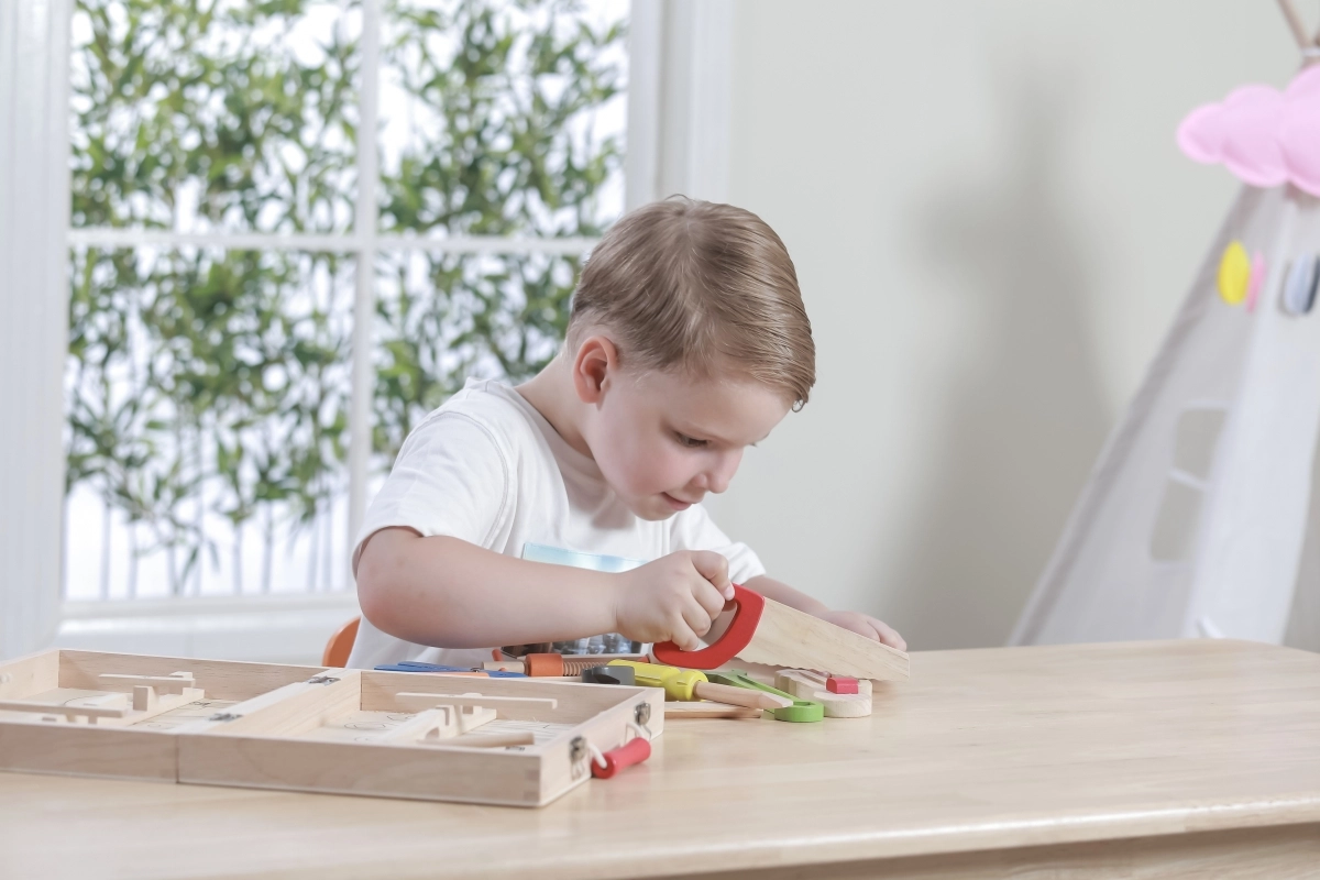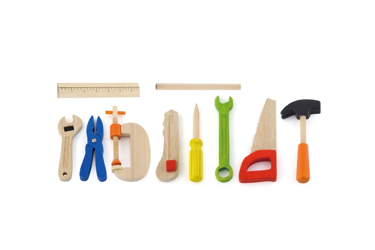 Plaktukas, pjūklelis, raktas, atsuktuvas ir kiti spalvingi įrankiai skatina kūrybišką žaidimą ir lavina smulkiąją motoriką bei koordinaciją.
