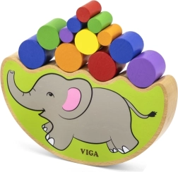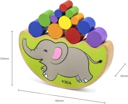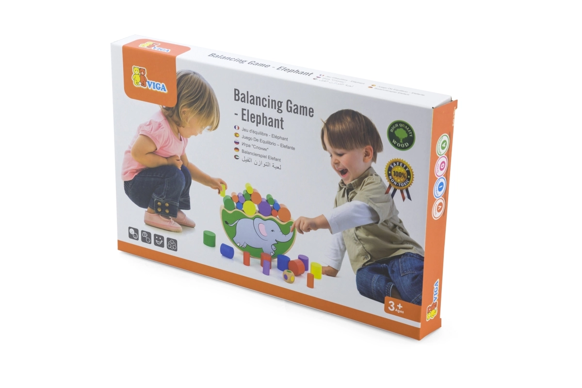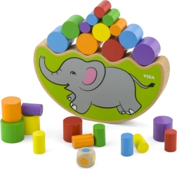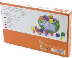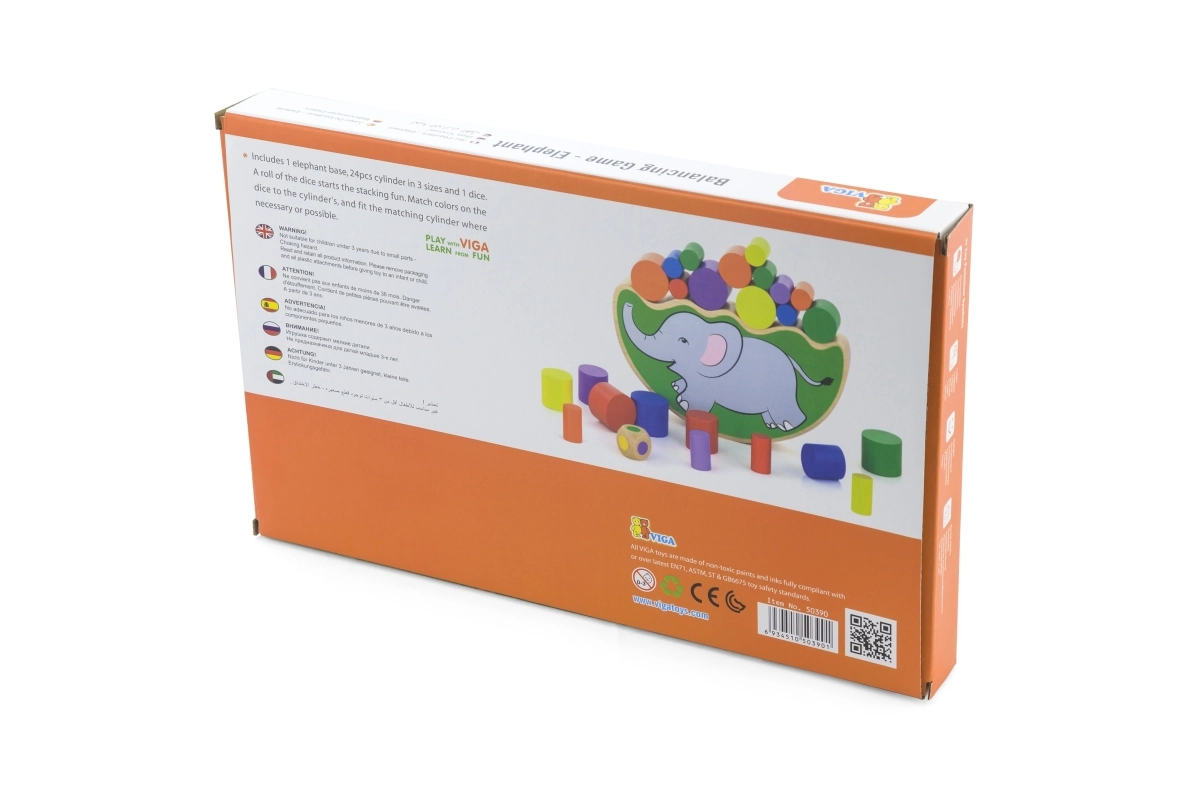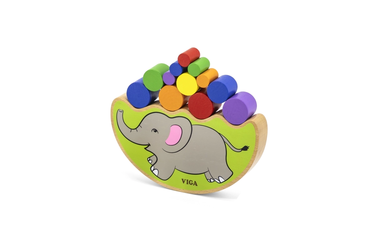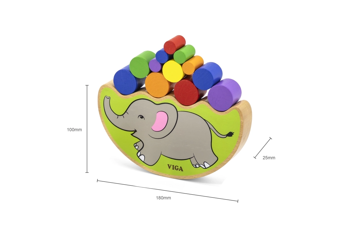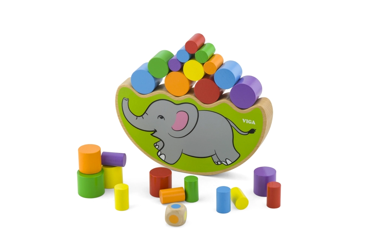 Šis sumanus balansavimo žaidimas su drambliu atneša įtampą ir džiaugsmą kiekviename raunde. Vaikai, pagal kauliuko metimą, dirba su spalvotais cilindrais ir mokosi pusiausvyros, spalvų atpažinimo ir judesių dermės. Žaidimas pagamintas iš glotniai apdirbtos medienos, naudojant ryškias ir saugias spalvas.