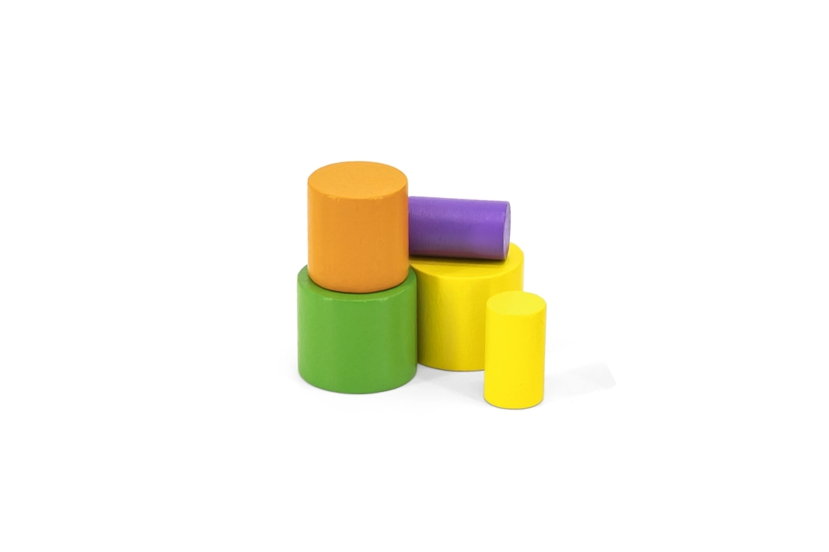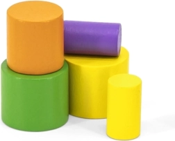 Išlenktas dramblio pagrindas ir skirtingo dydžio cilindrai moko vaikus jautriai išlaikyti pusiausvyrą ir tiksliai dėlioti detales.