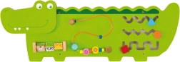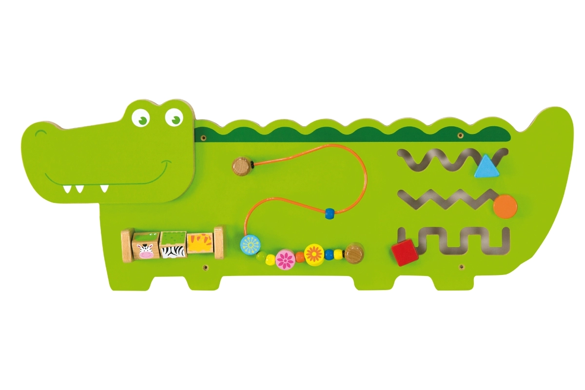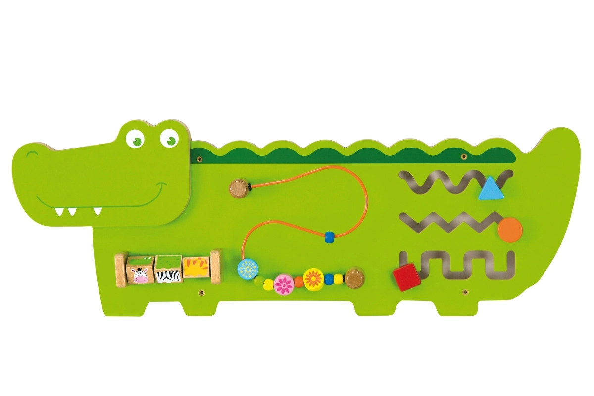 Atraskite linksmą ir edukacinį žaislą, kuris taupo vietą – sieninė krokodilo lenta sujungia kelias veiklas į vieną kompaktišką sprendimą. Vaikai gali stumdyti formas 3 labirintuose, mankštinti pirštukus vieliniame vėrimo takelyje su karoliukais ir dėlioti paveikslėlius iš besisukančių kubelių–dėlionės. Ryškios spalvos ir mielas dizainas iš karto kviečia žaisti.
